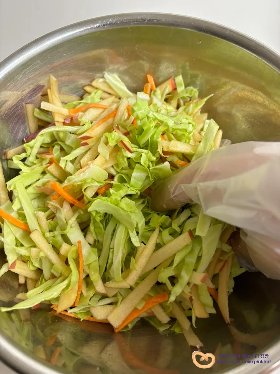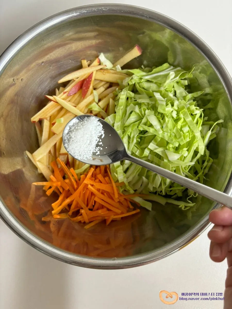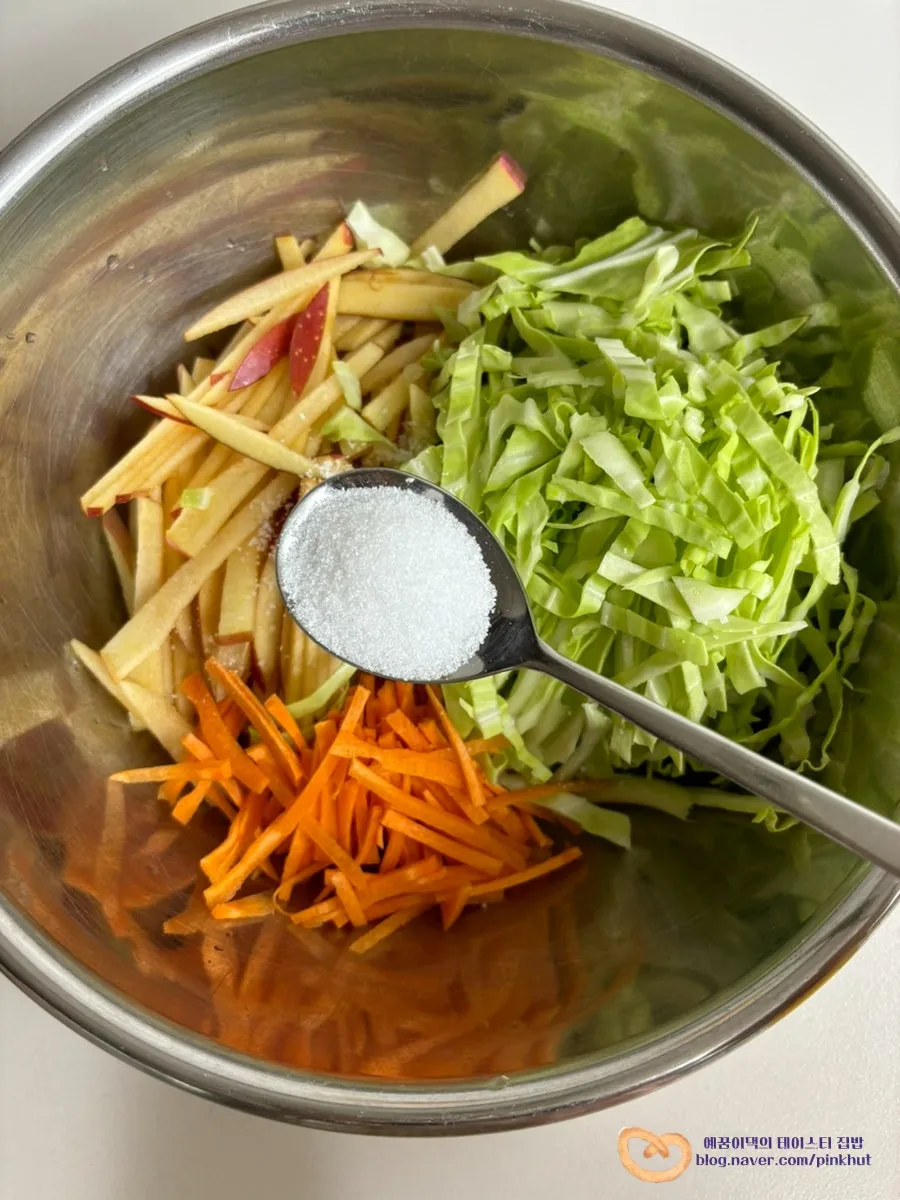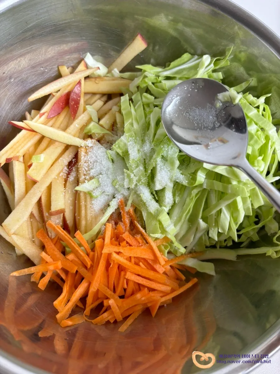 채 썬 사과, 양배추, 당근에 소금, 설탕, 식초를