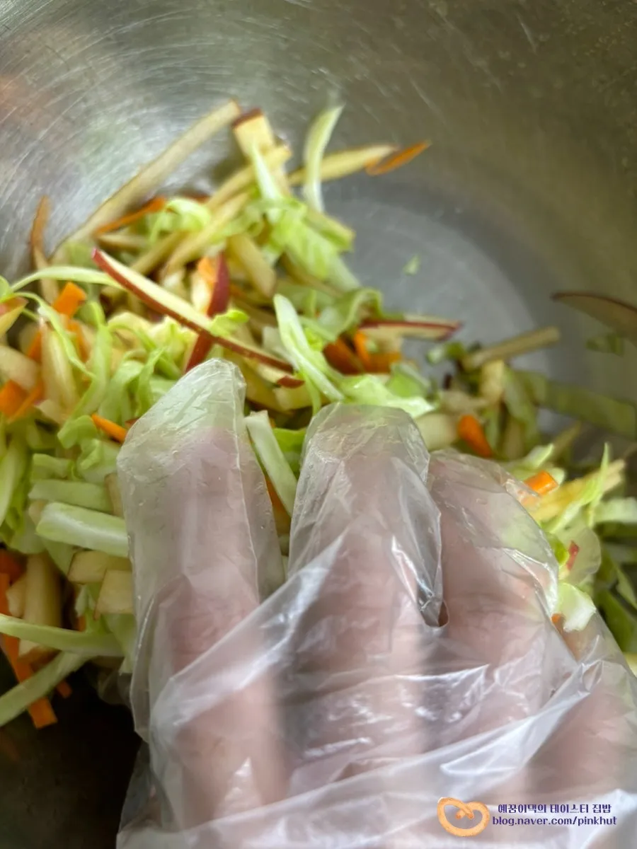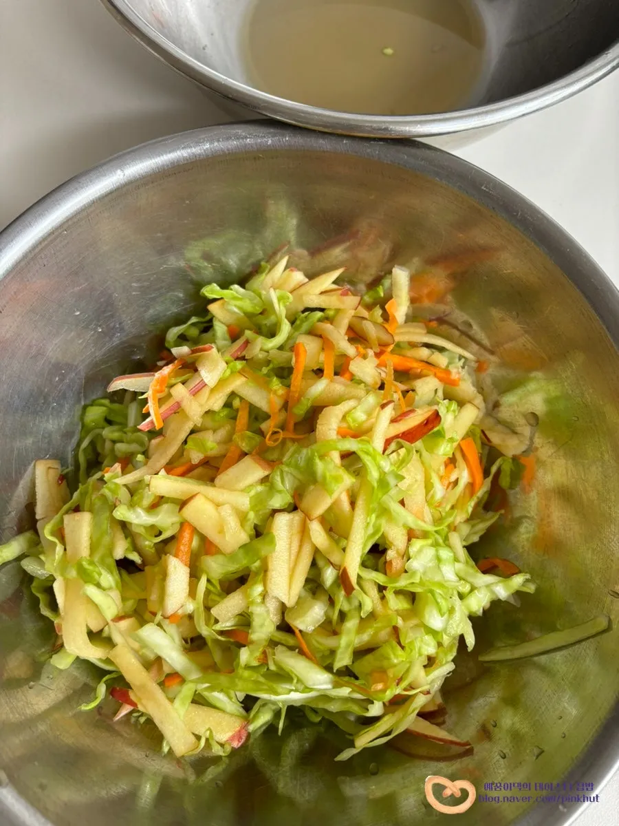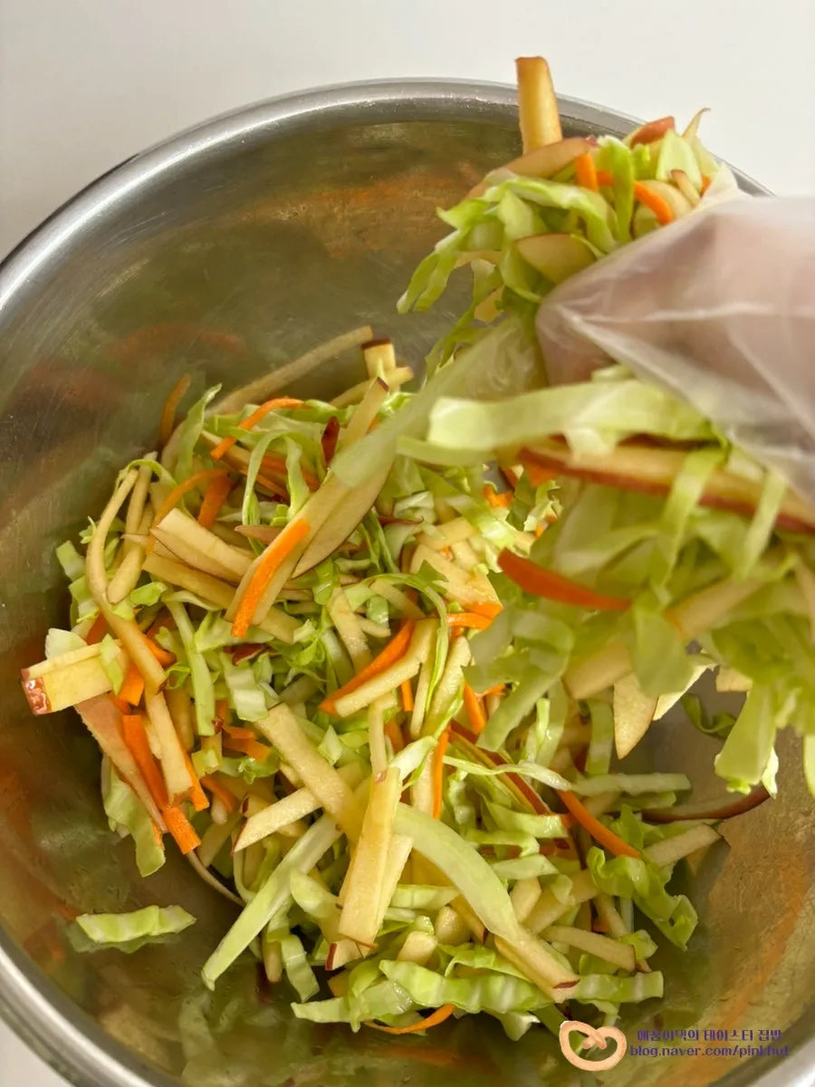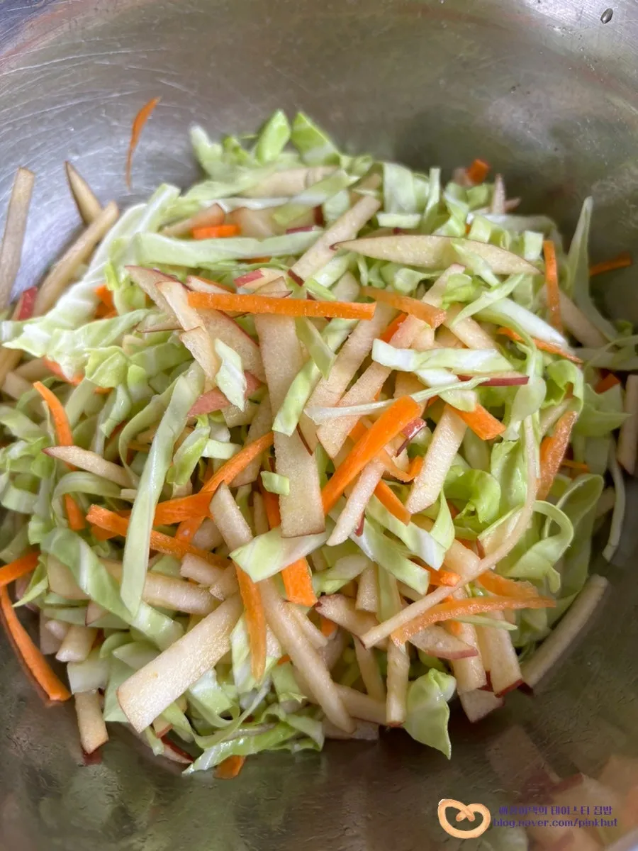 채 썬 사과, 양배추, 당근에 소금, 설탕, 식초를
