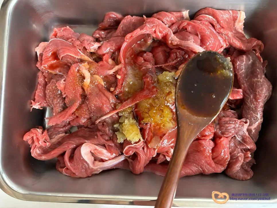 두께감이 얇고 마블링이 있는 고기를 사용하면