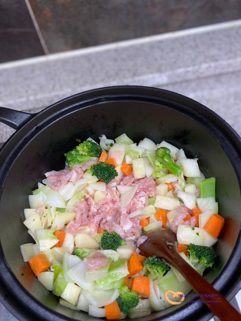 돼지고기, 감자, 양파, 당근, 브로콜리.