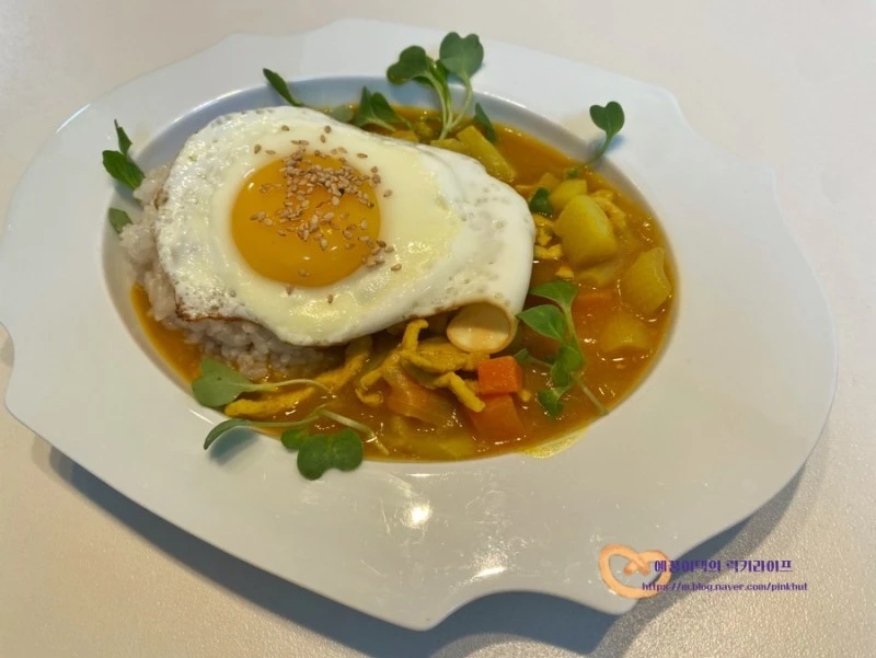 접시에 밥과 카레를 붓고 계란후라이 올려서 드셔보세요