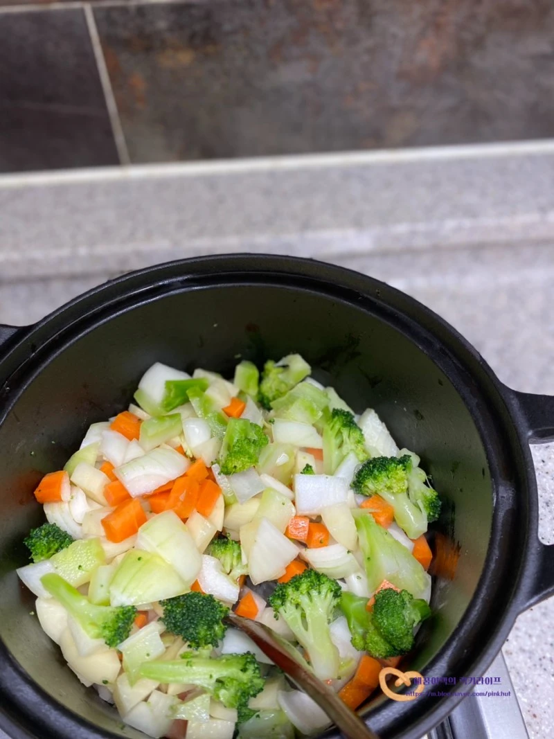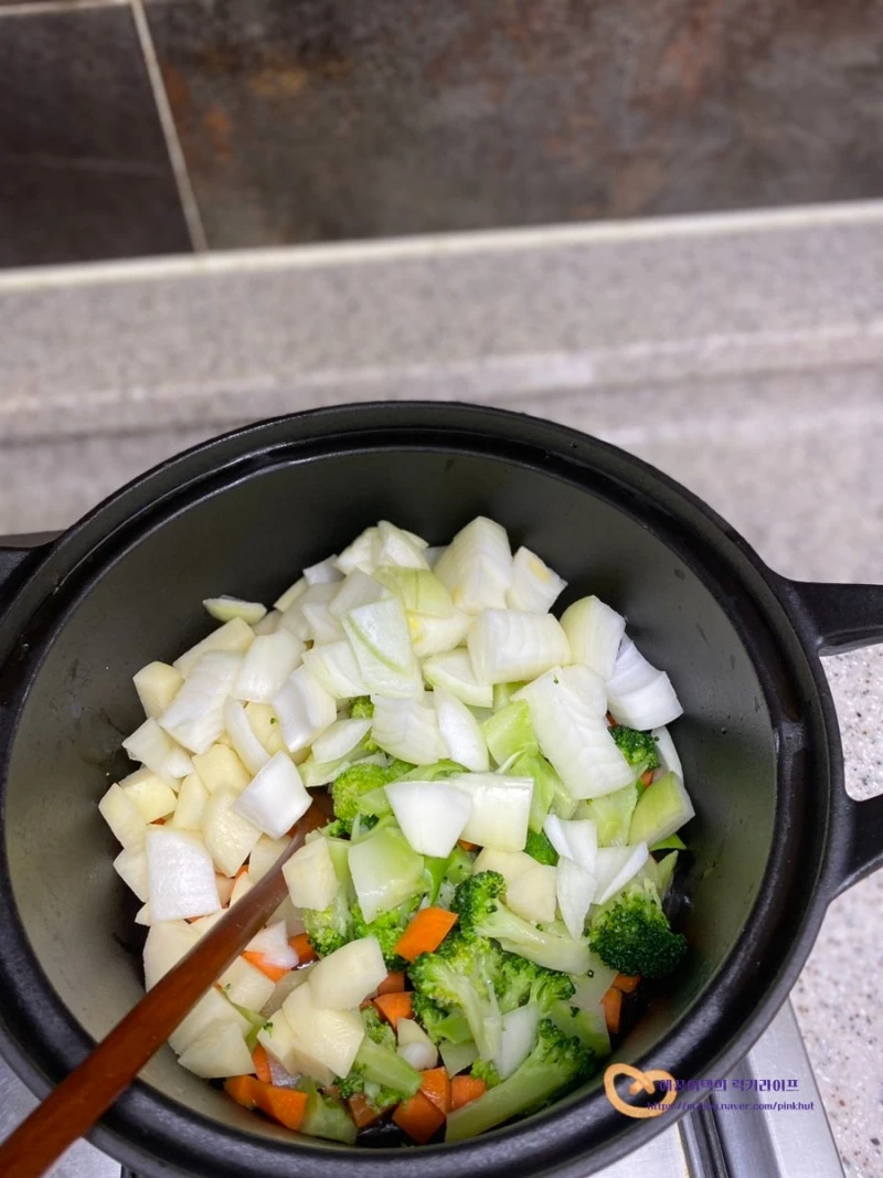 냄비에 올리브유 4T를 두르고 감자, 당근, 양파, 브로콜리를 넣어주세요