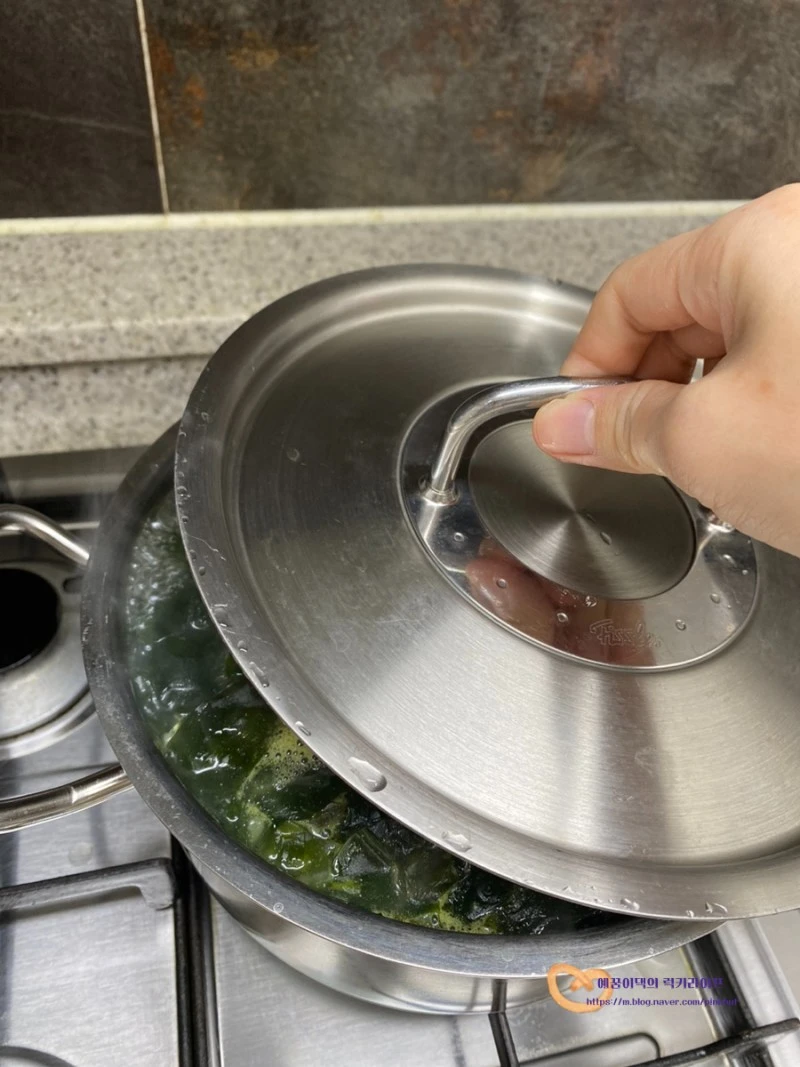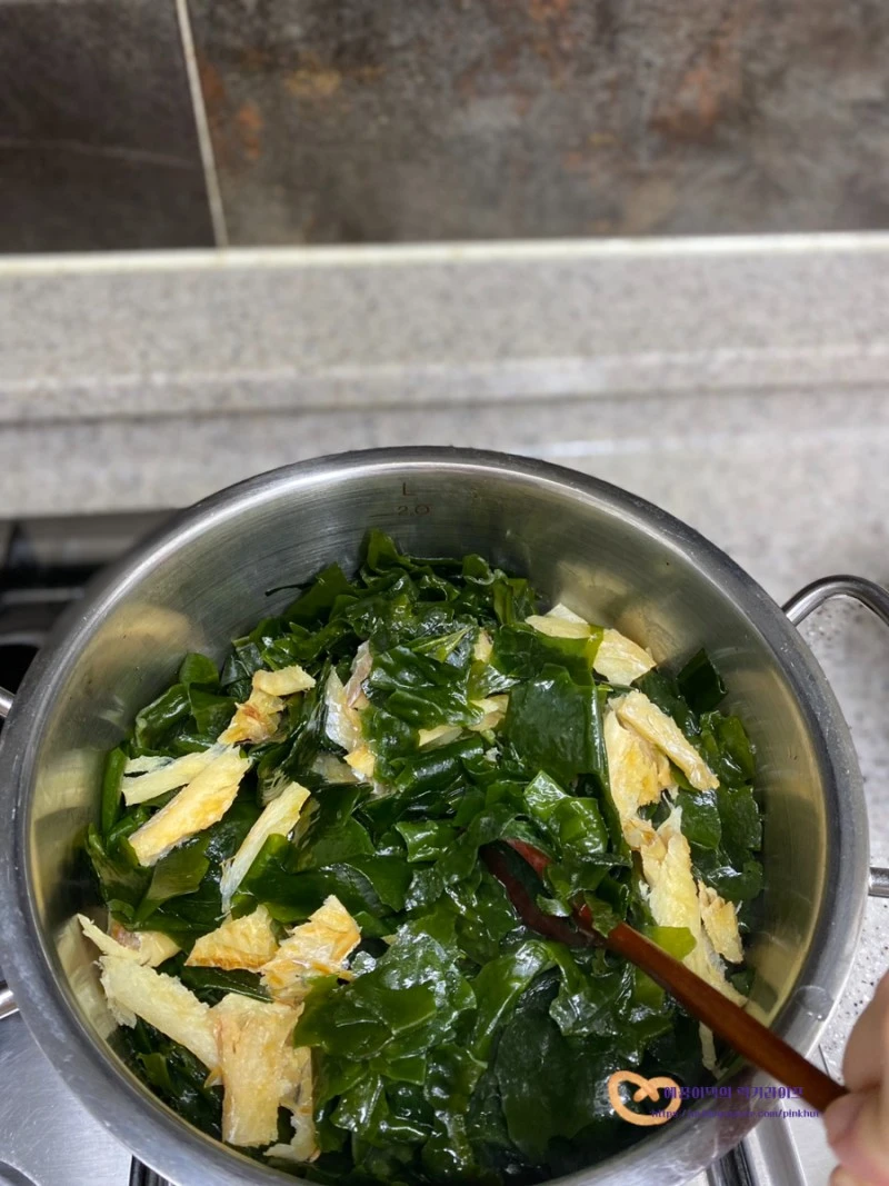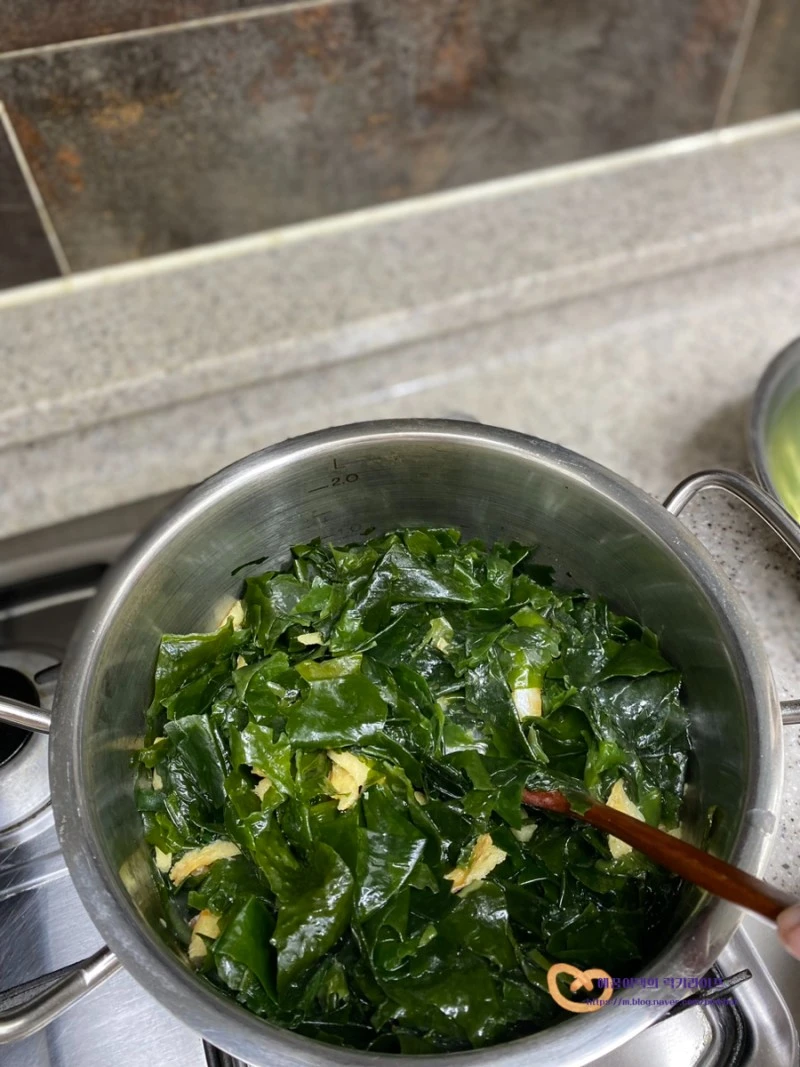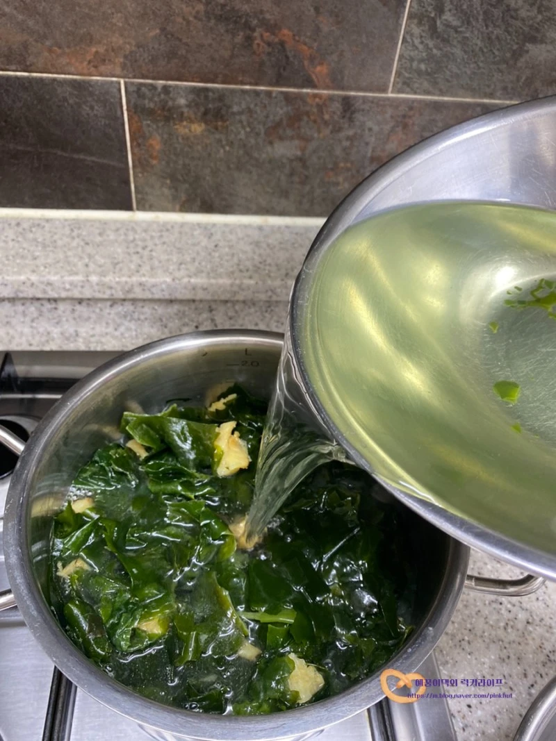 5. 미역의 색이 선명해지면 미역 불린 물 1.8L를 부어줍니다