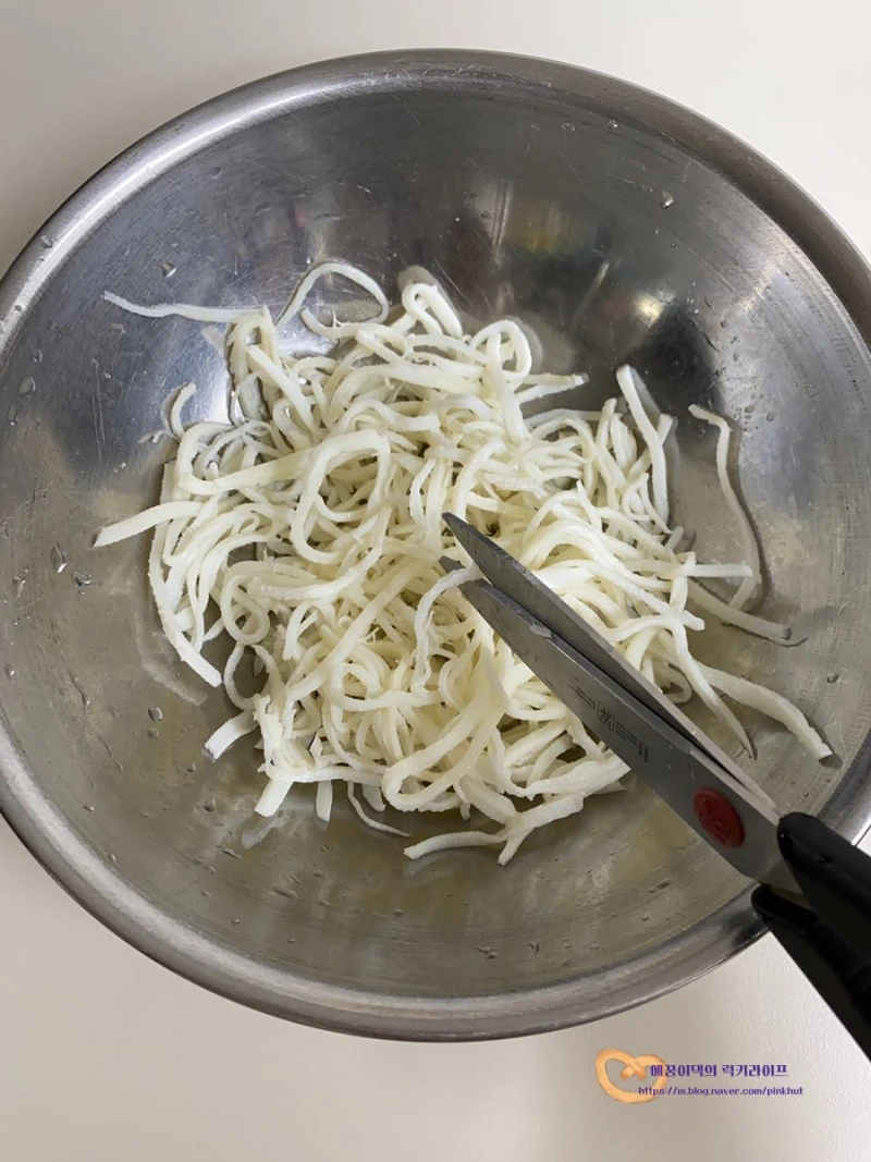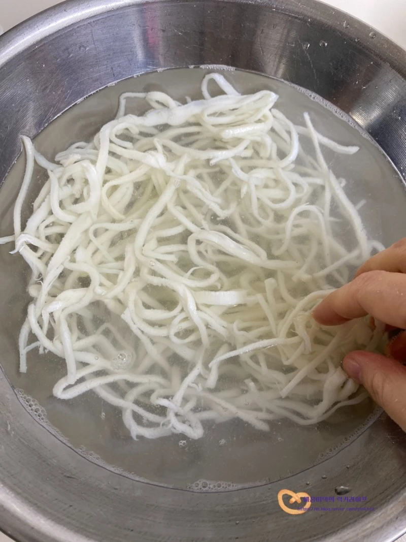 볼에 백진미채 150g와 물을 넣고 살살 흔들어서 가볍게 세척을 해 주었어요