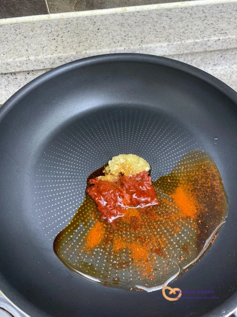 팬에 다진마늘 1T, 고추장 1.5T, 고춧가루 1T,
