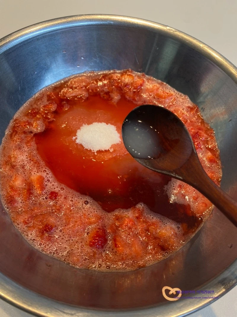 딸기를 냄비에 넣고 바로 으깨서 작업하셔도 된답니다