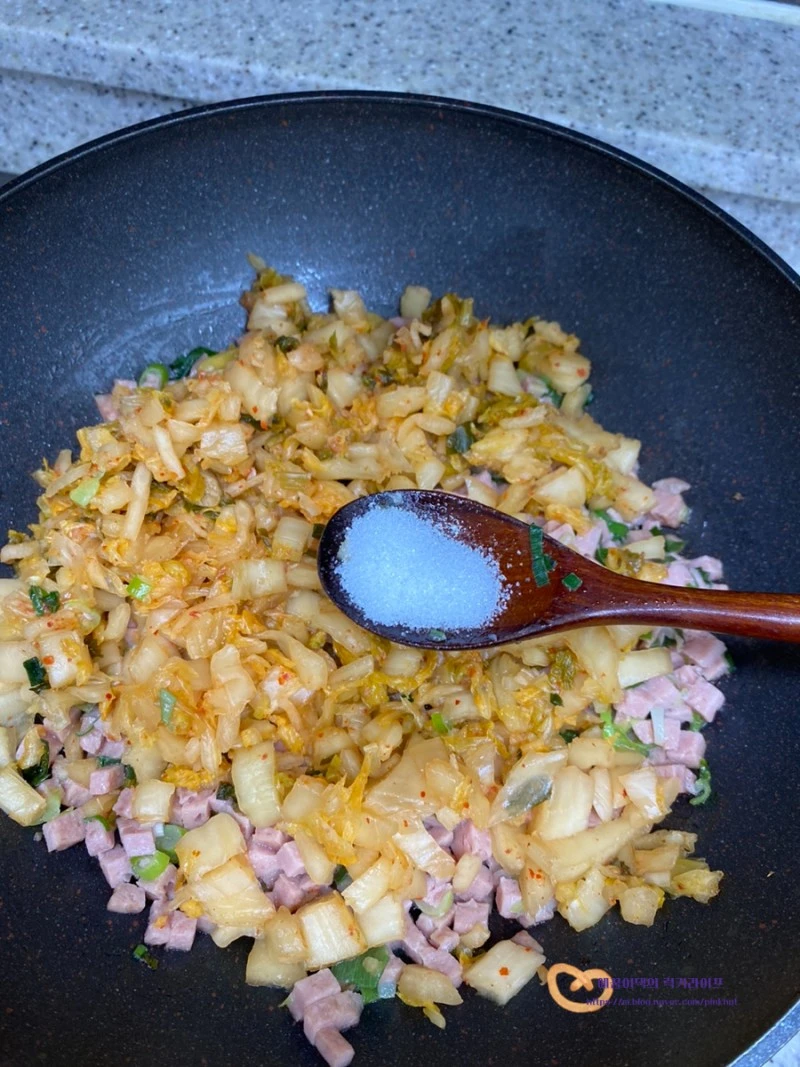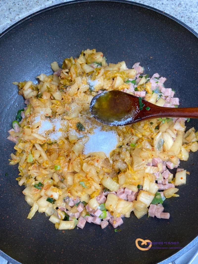 김치의 신맛을 줄여 줄 양념재료 참치액 1.5T, 설탕 3T, 참기름 2T 를 넣어서 볶아주세요