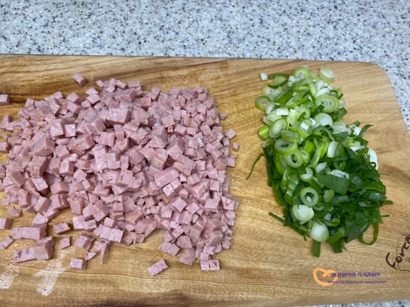 스팸은 네모난 모양으로 작게 썰어주었어요