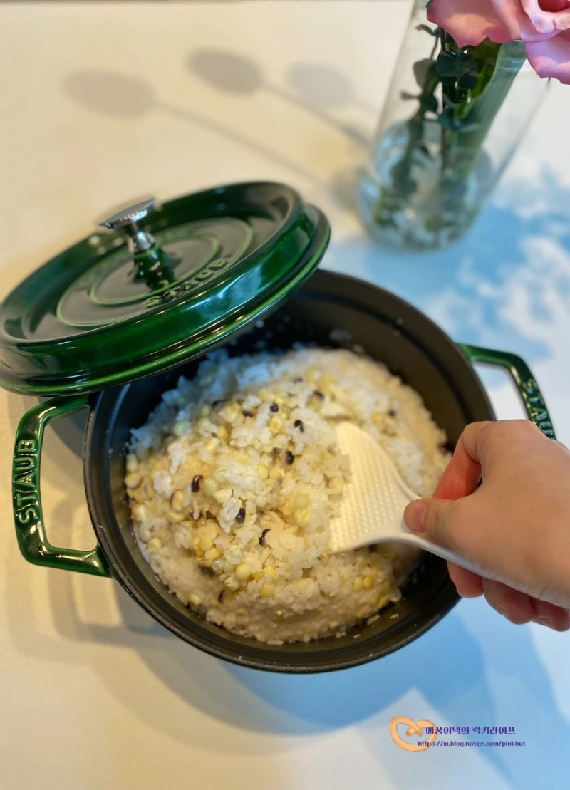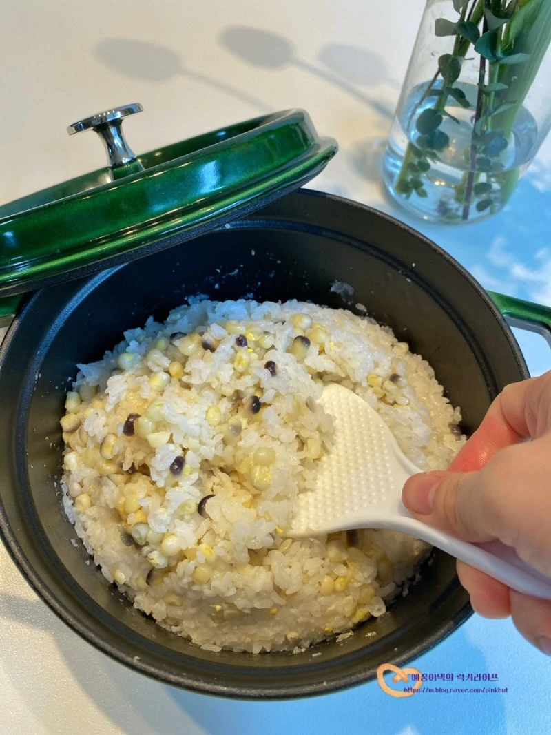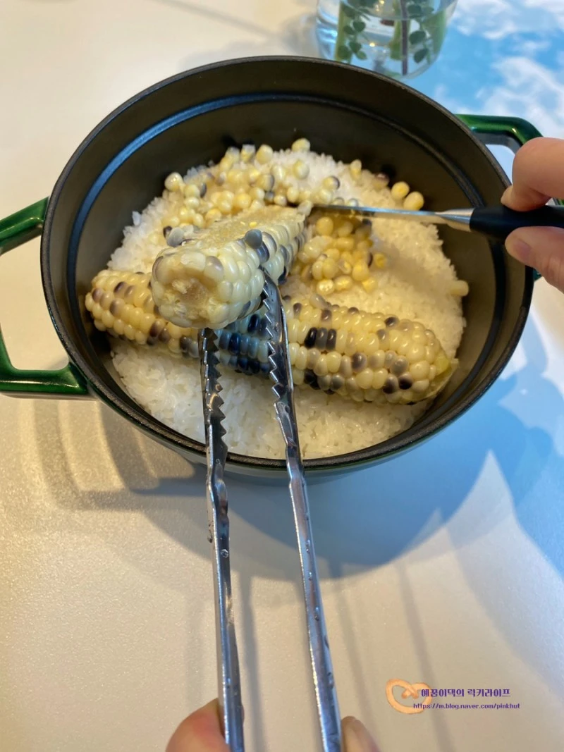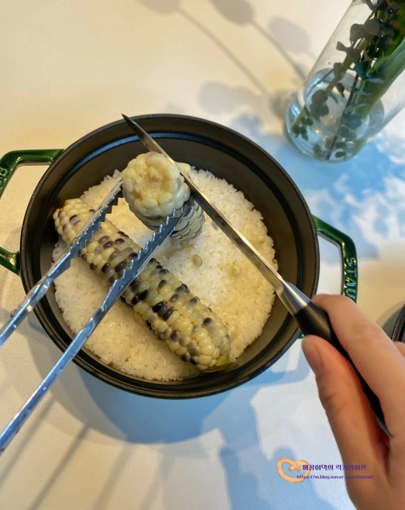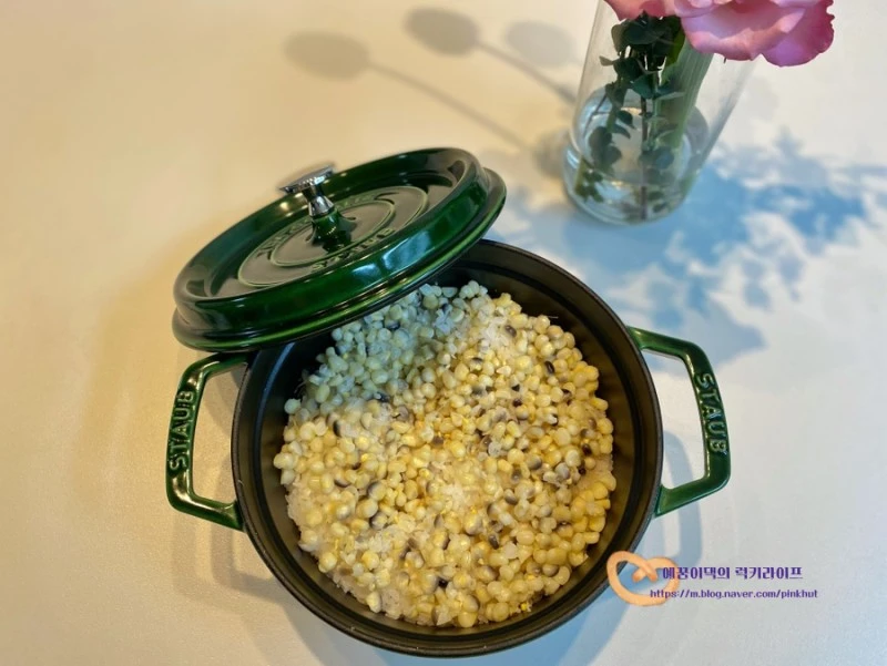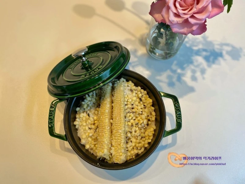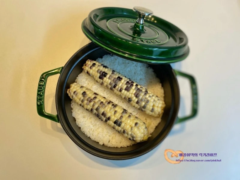 저는 스타우브 무쇠솥을 사용해서 옥수수밥 레시피를 만들었답니다