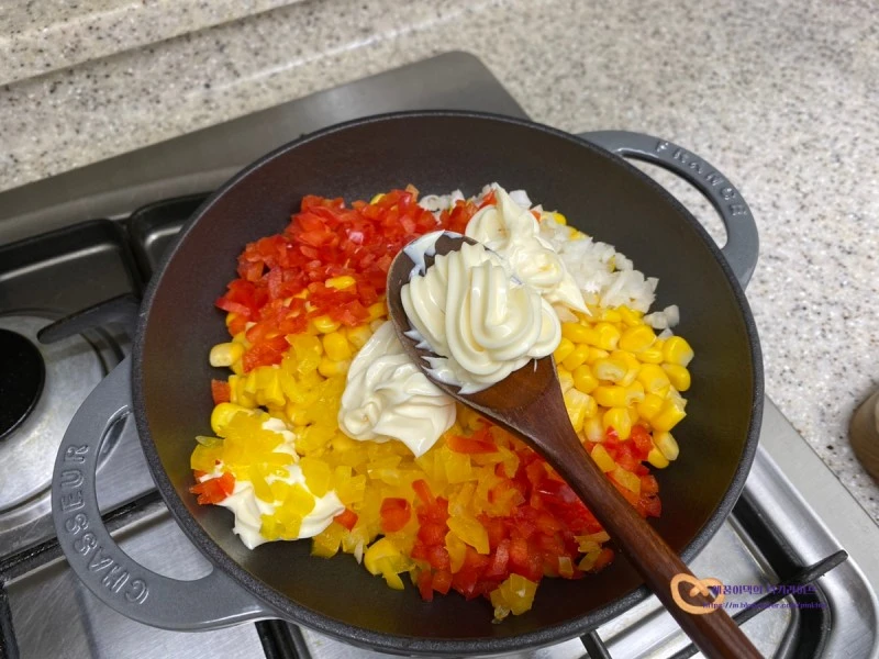 마요네즈 콘샐러드에 모짜렐라 치즈를 뿌려서 녹여준 것이