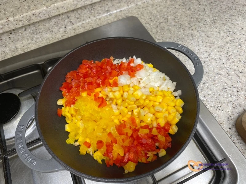 주물팬 미니웍에 옥수수와 파프리카, 양파를 넣어줍니다