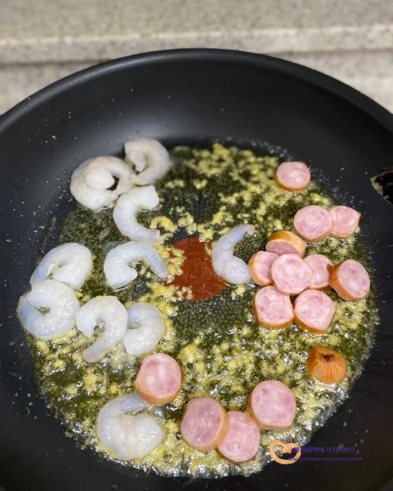 5. 새우 마늘갈릭, 소세지 토핑 올리고 익히기