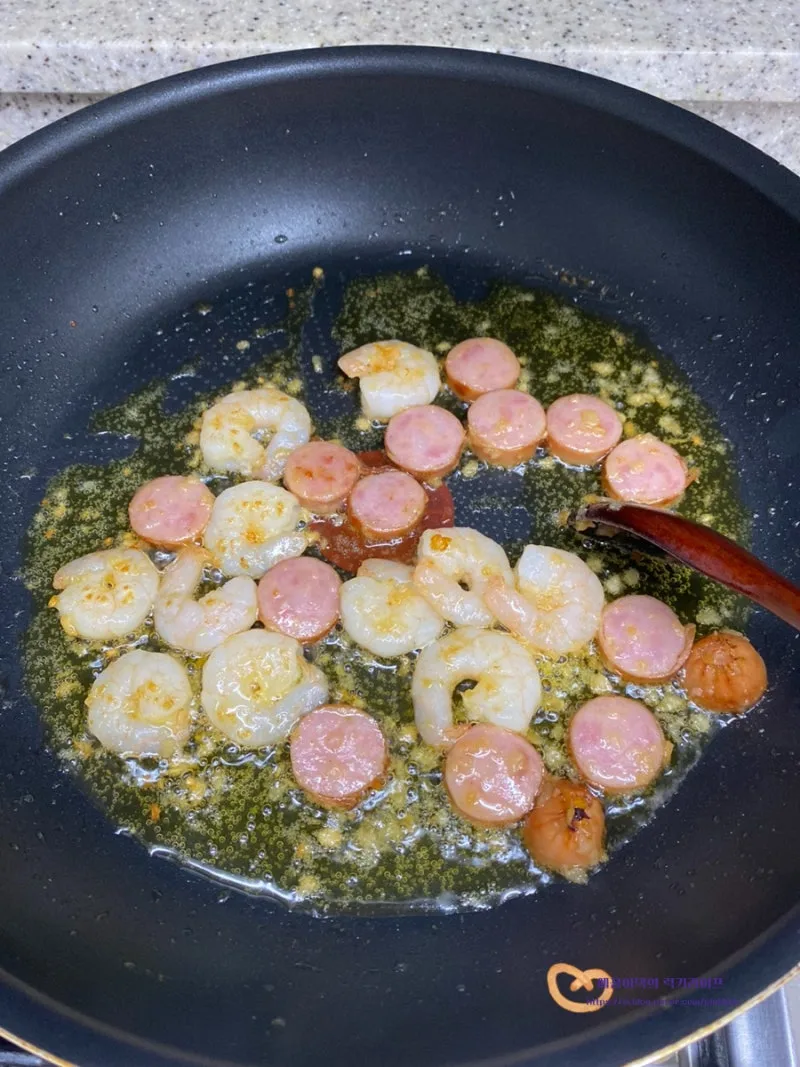 뒤적여가며 새우와 소세지를 노릇노릇하게 볶아주고