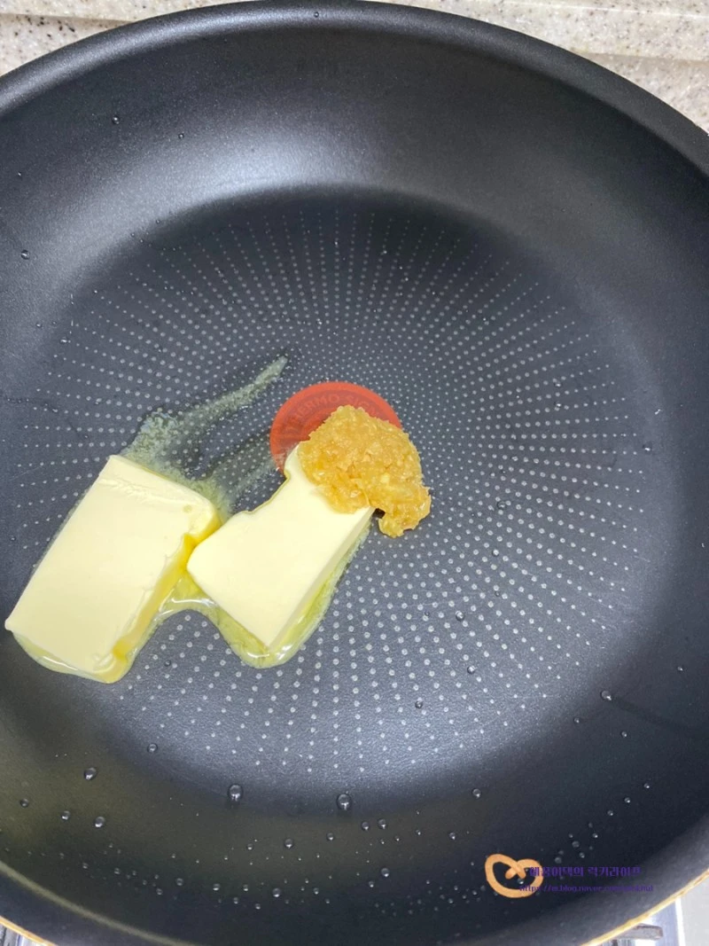 팬에 버터와 다진마늘을 넣고 중약불로 불을 켜고