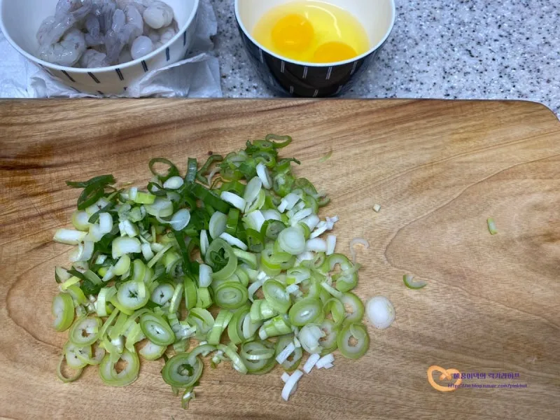 들어가는 재료는 계란, 대파, 냉동 새우로.