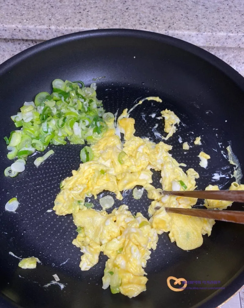 볶아진 파를 팬 한 쪽으로 모아준 후에,