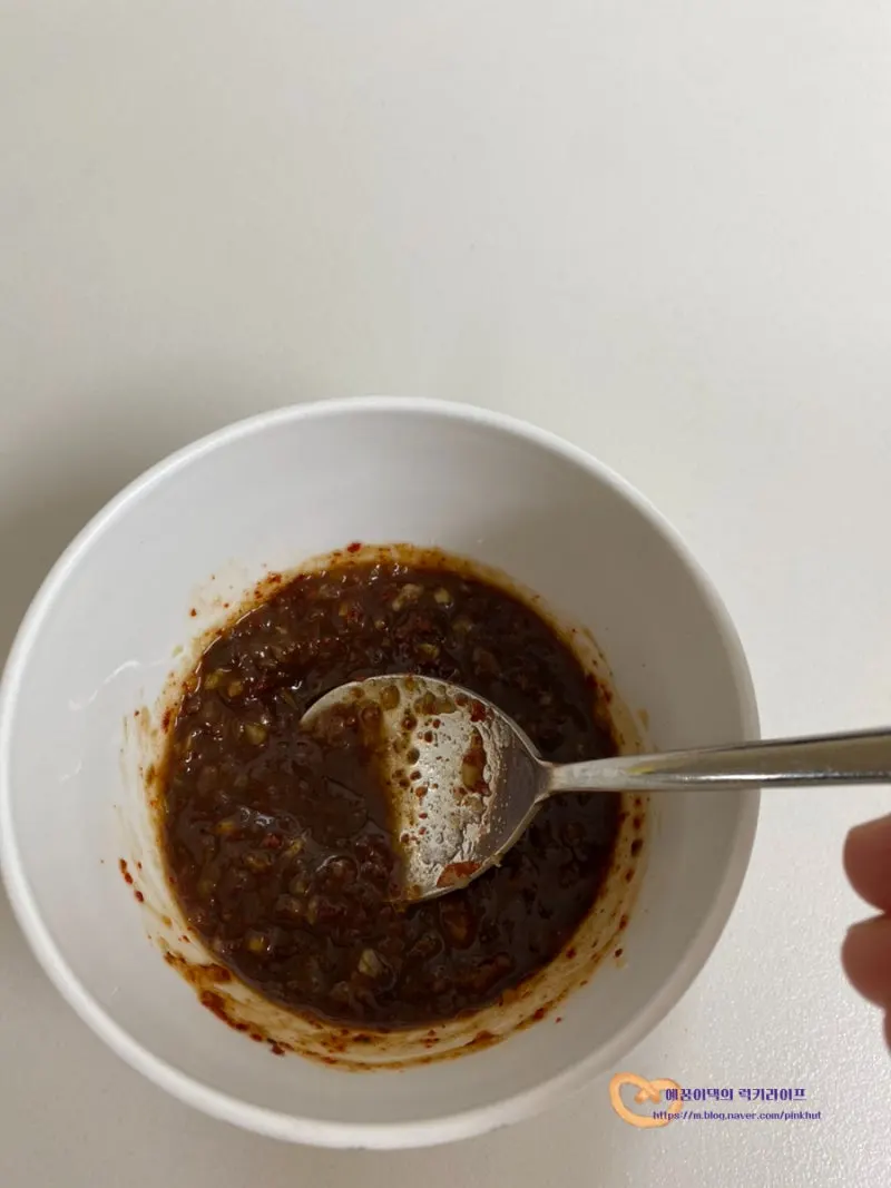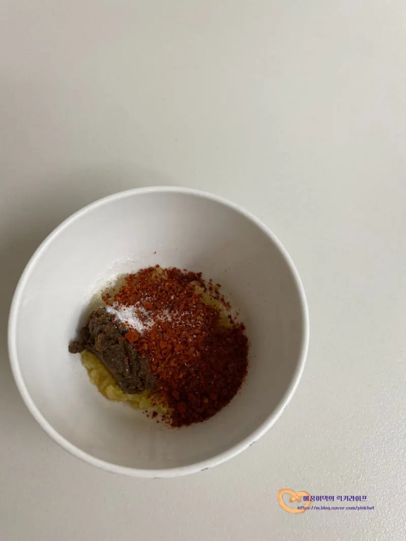 볼에 다진마늘 1T, 고춧가루 2T, 된장 1T,