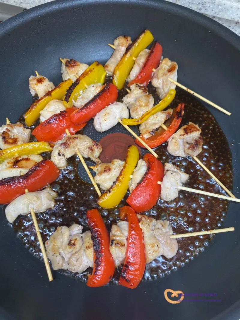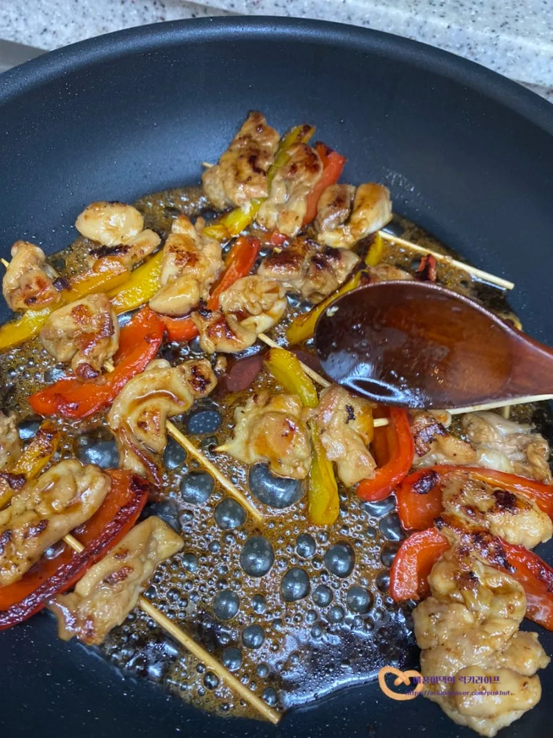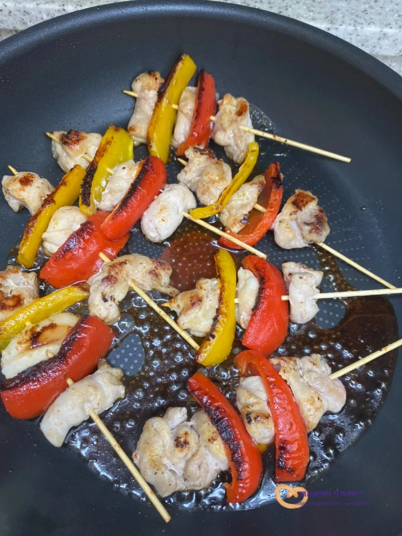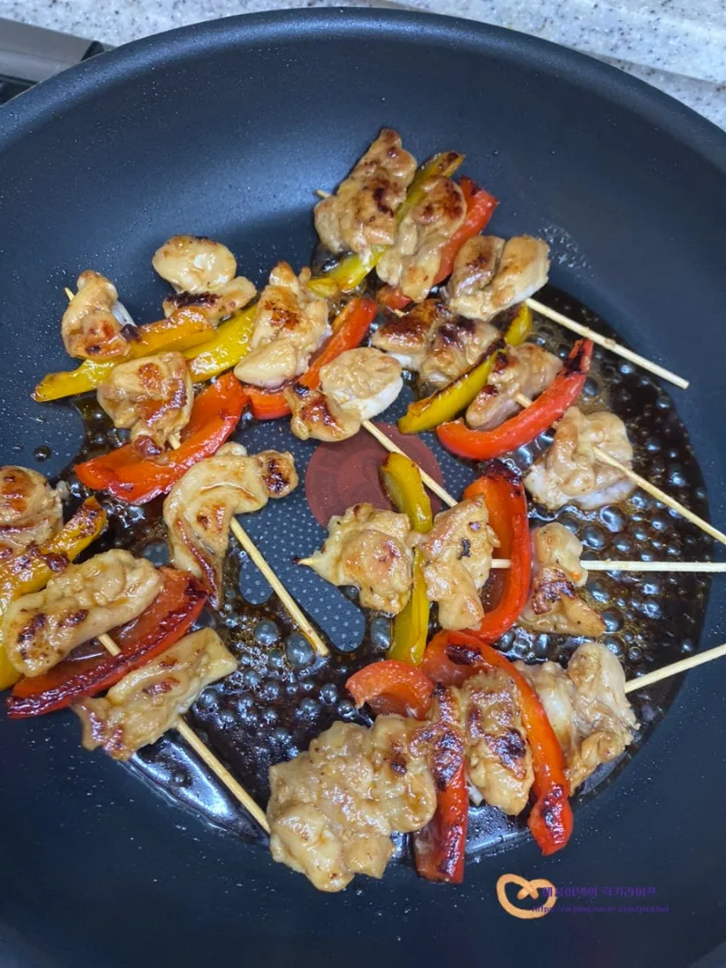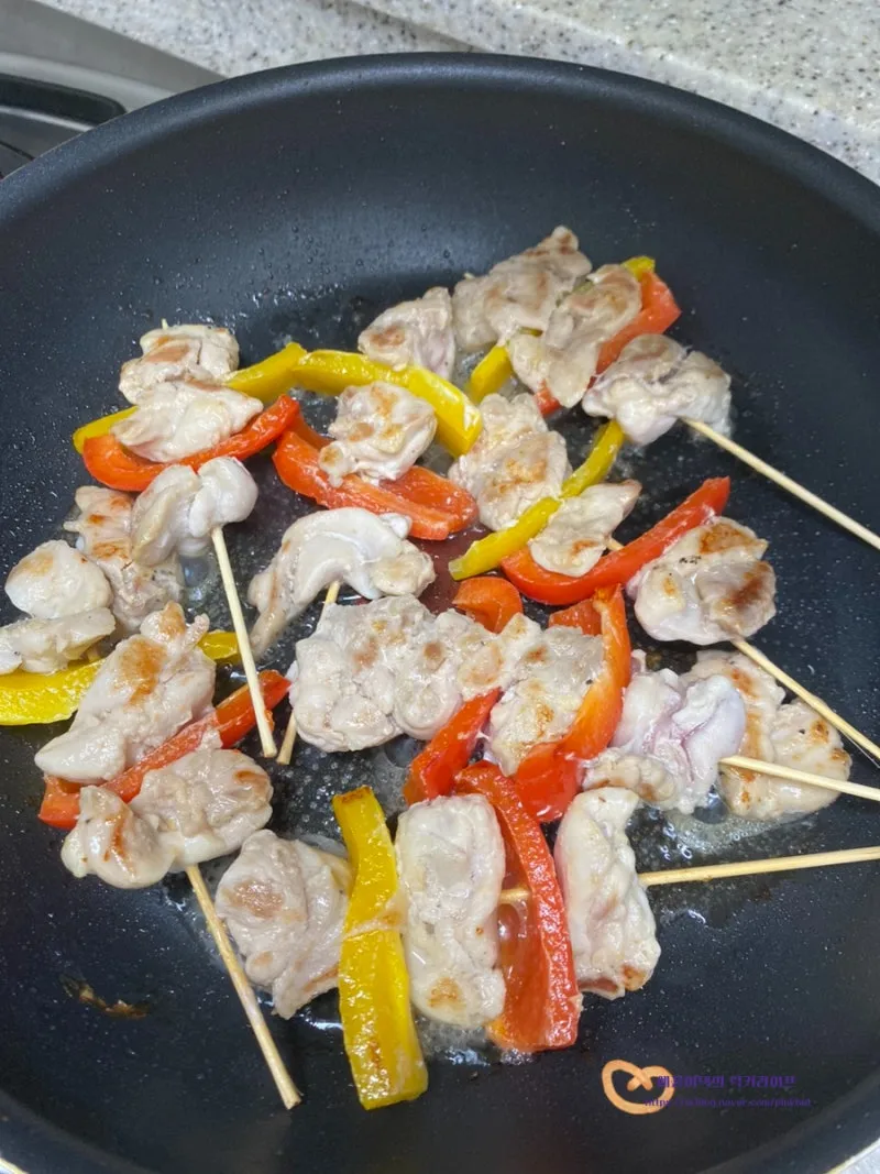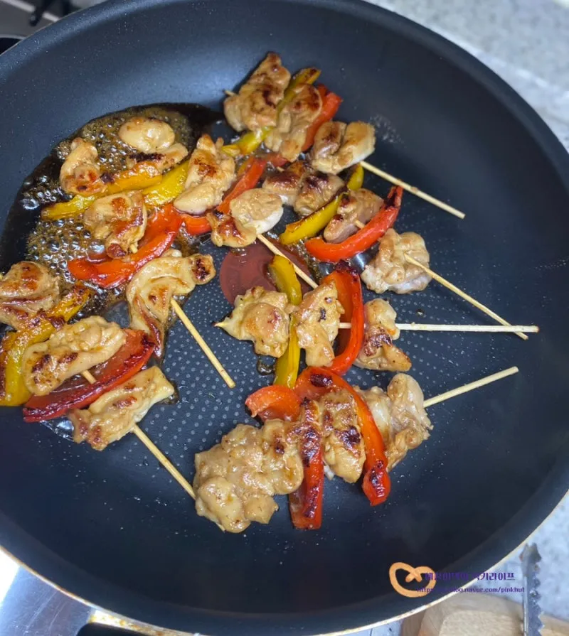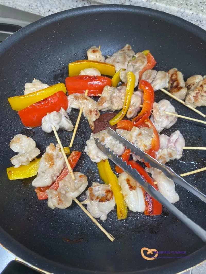 4. 팬에 식용유 두르고 닭꼬치 구워내기