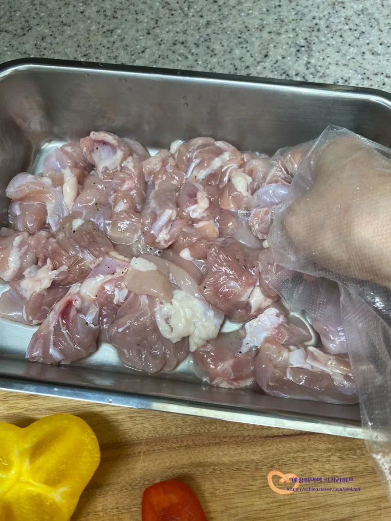 꼬치 1개당 닭다리살 3개, 파프리카 2개 분량으로