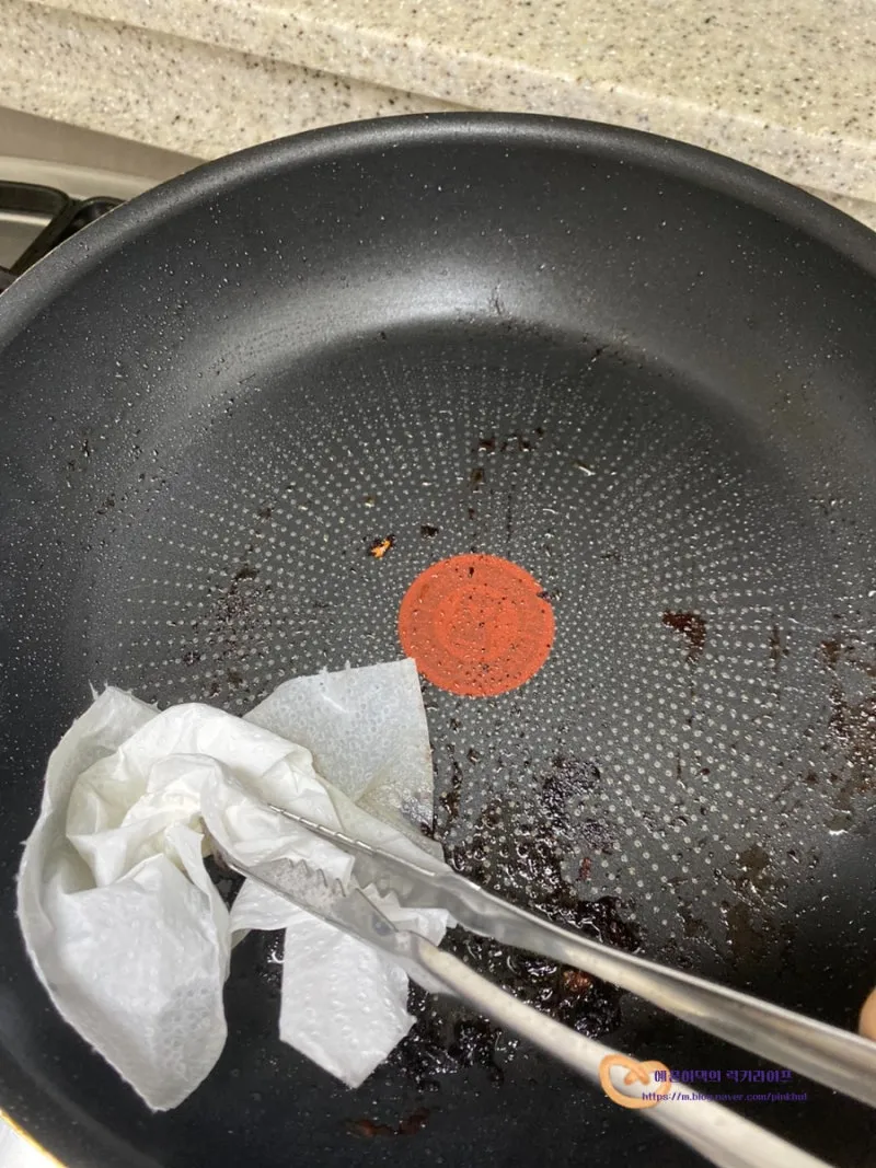그러고 나서 닭꼬치 구웠던 팬을 키친타올로 깨끗이 정리하고