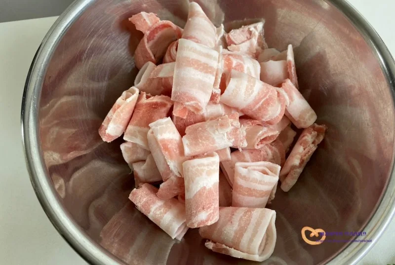 청경채나물에 대패삼겹 한점을 돌돌 싸서 먹으면