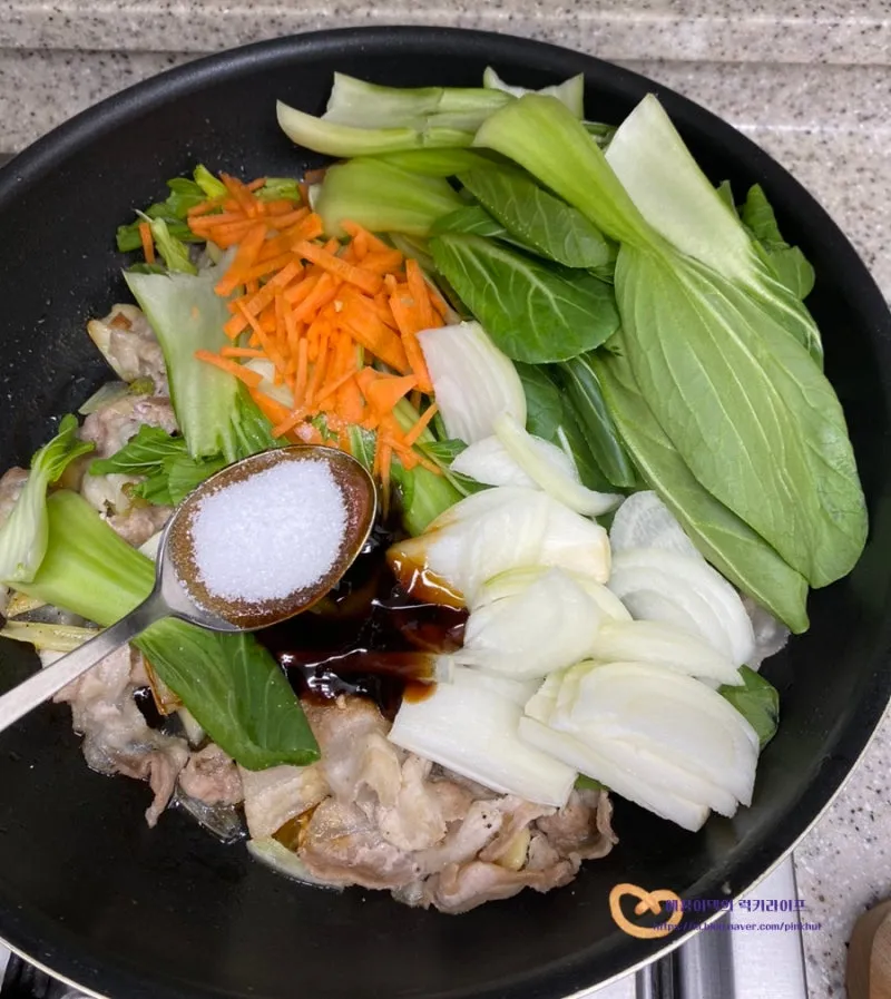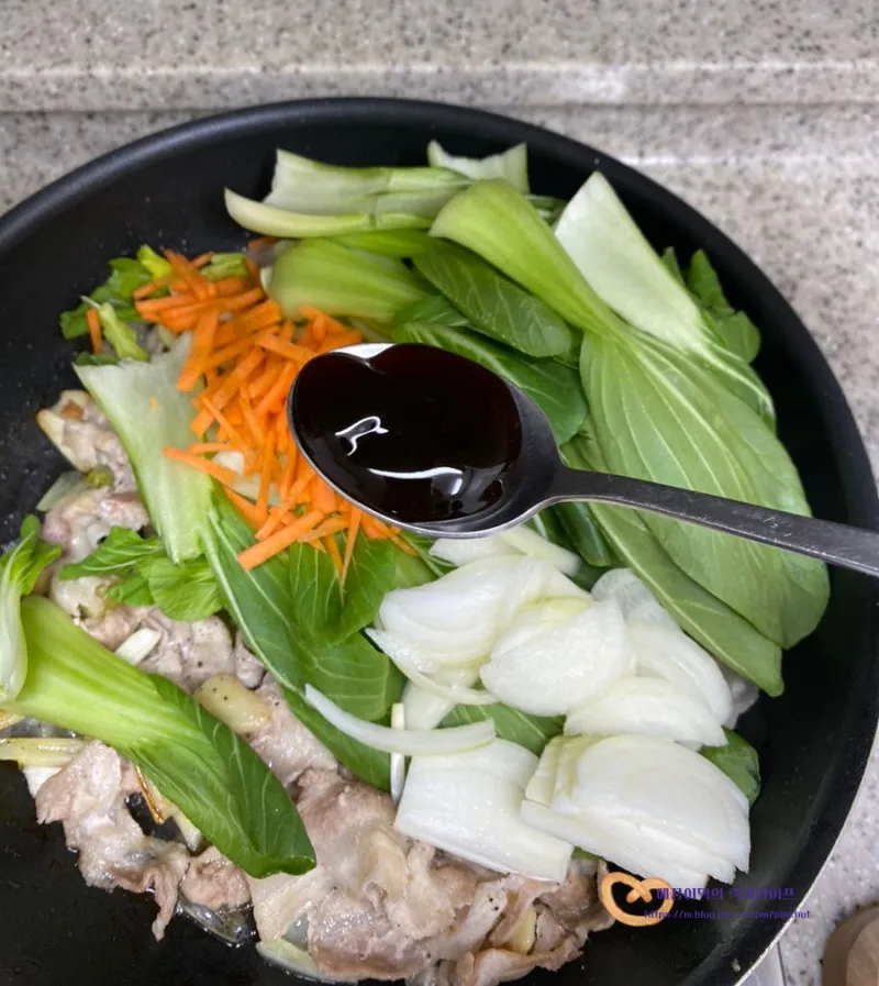 3. 양념해 주기. 채소와 청경채 넣고 휘리릭 볶기
