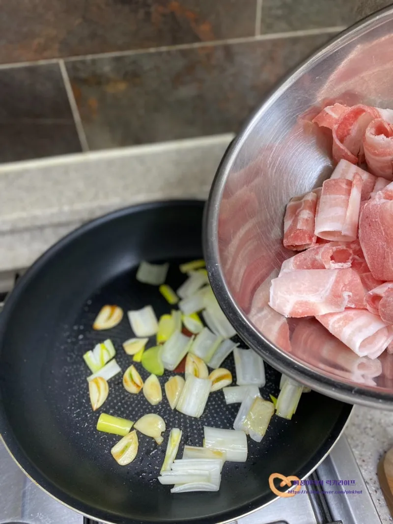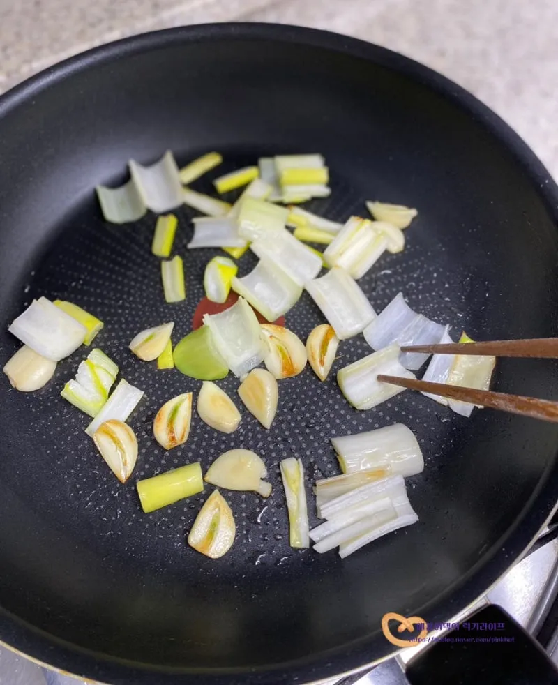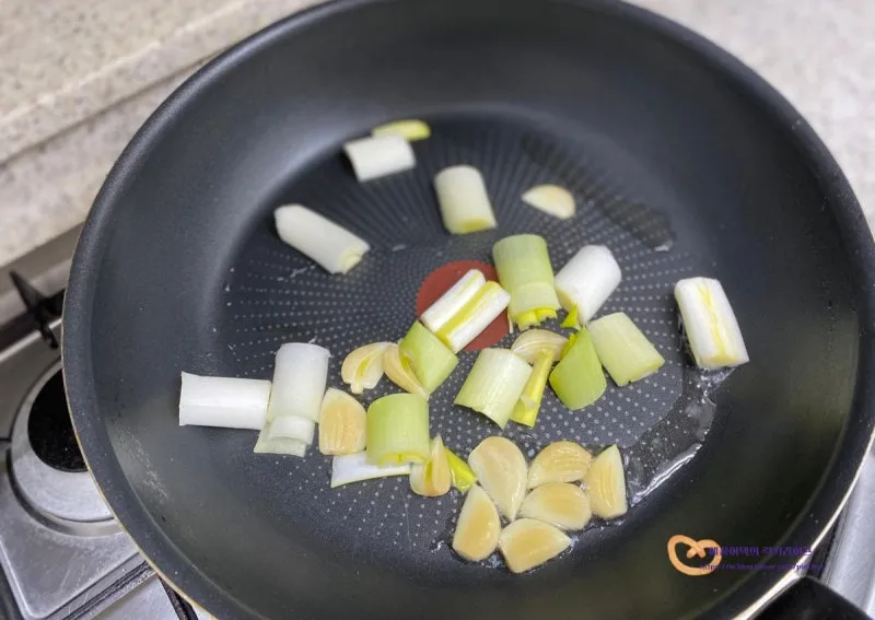 팬에 식용유 2T, 마늘, 대파를 넣고 중강불로 불을 켜 주세요