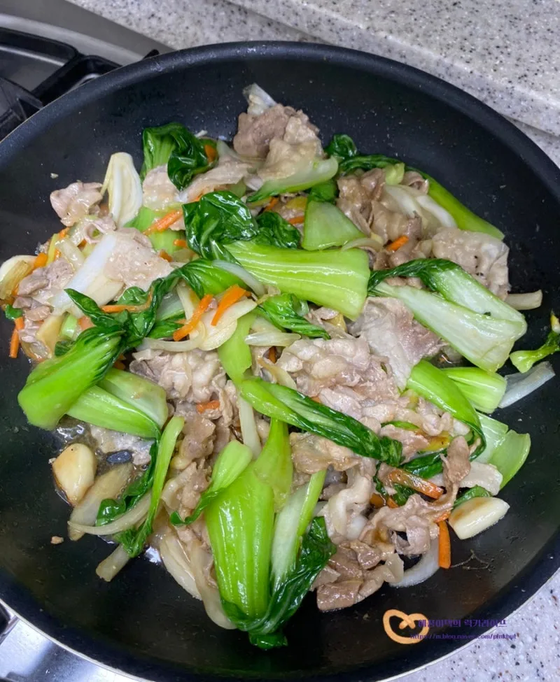 청경채 굴소스볶음에 고기를 추가해서 만들면