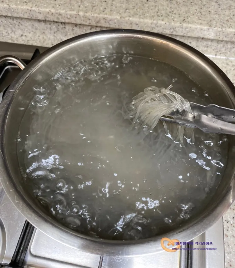 당면 삶는시간 4분이 지나면 찬물로 헹궈주고,