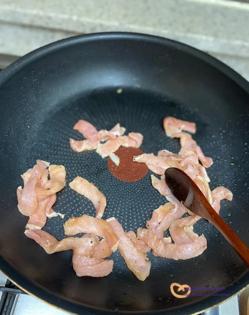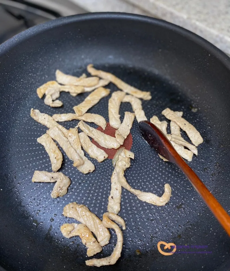 채소를 볶았던 팬에 밑간해 둔 돼지고기를 넣고