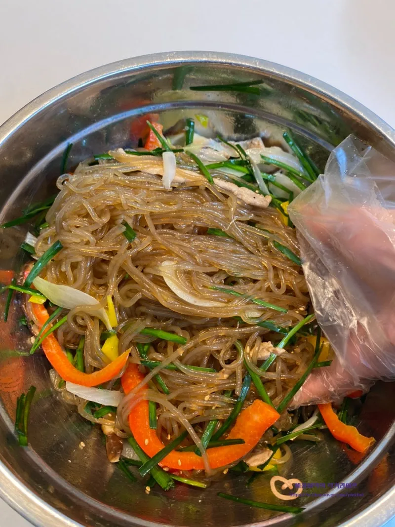 양념된 잡채와 채소가 골고루 버무려질 수 있도록