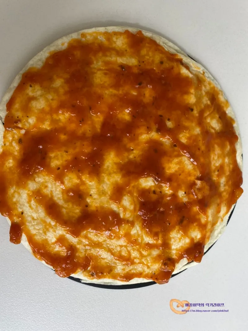 토마토 소스를 골고루 펴서 발라주세요 :)