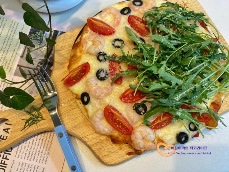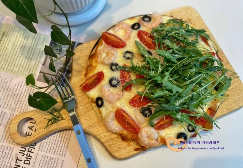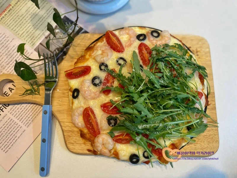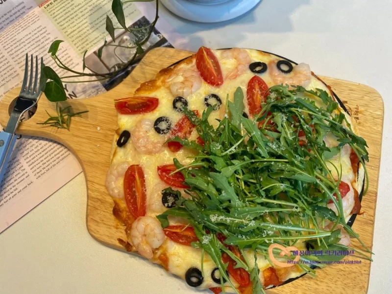 새우 토마토 루꼴라 피자 완성이에요 :)