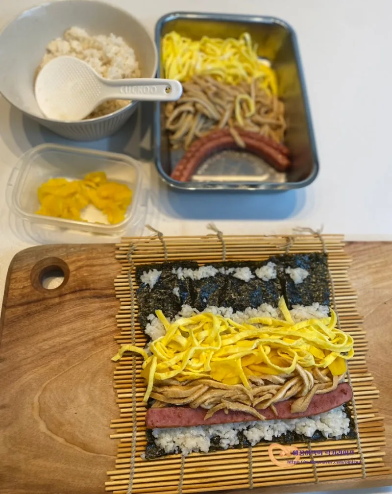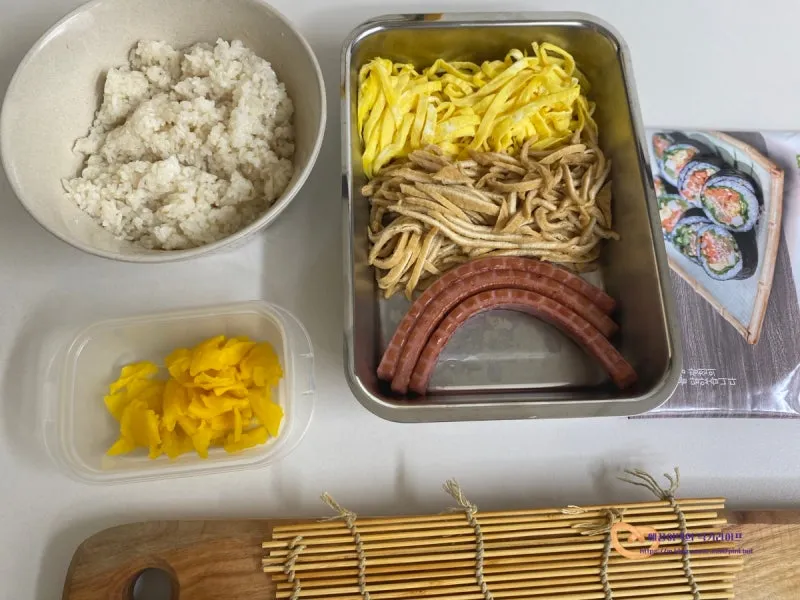 김밥 속 재료로 햄, 계란지단, 단무지,