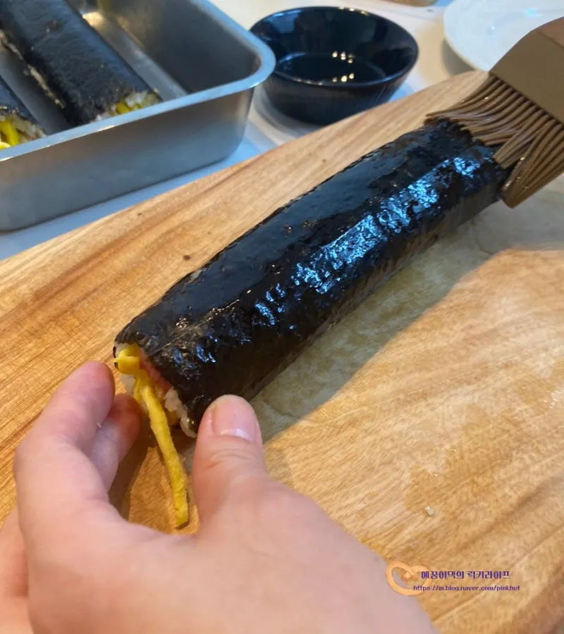 참기름을 김밥 겉면에 쓱쓱 바르고