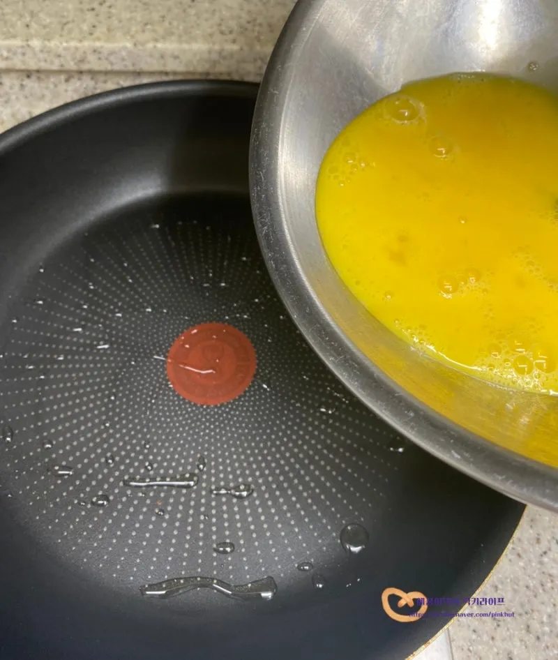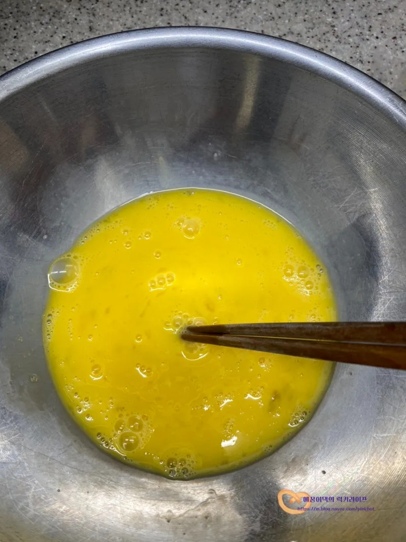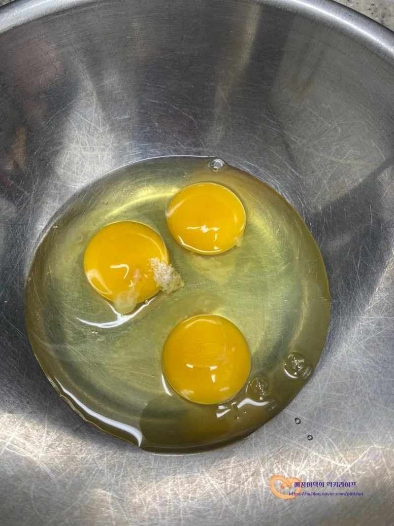 볼에 계란 3개, 소금 1꼬집을 넣어 잘 풀어주고