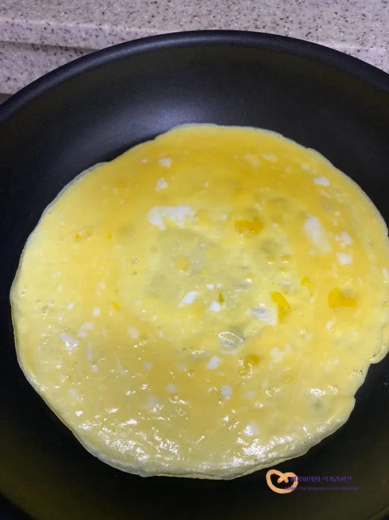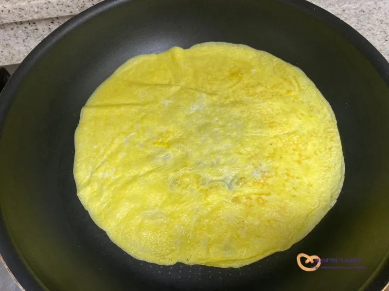 약불로 불을 줄이고 계란물 1/3 분량을 붓고