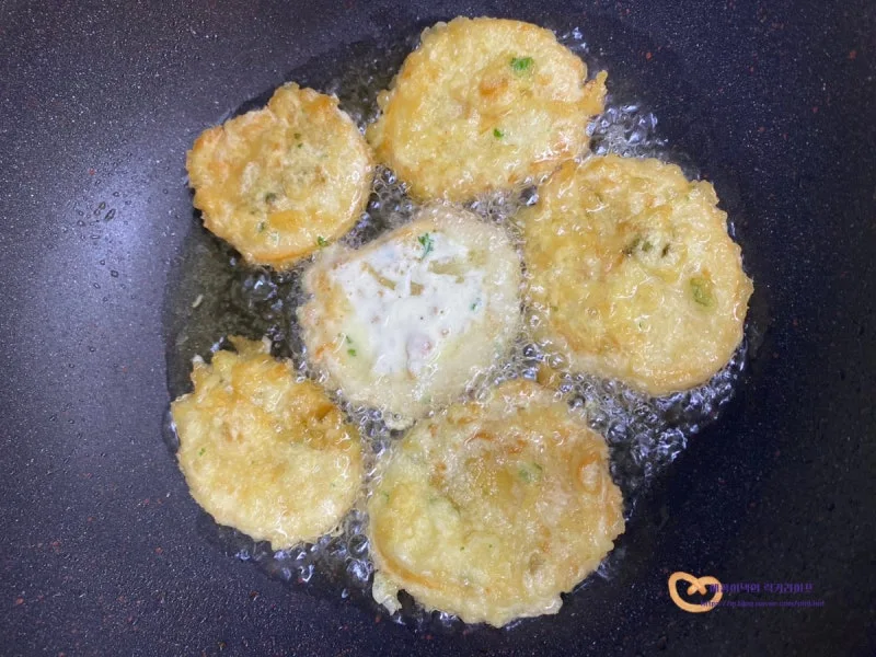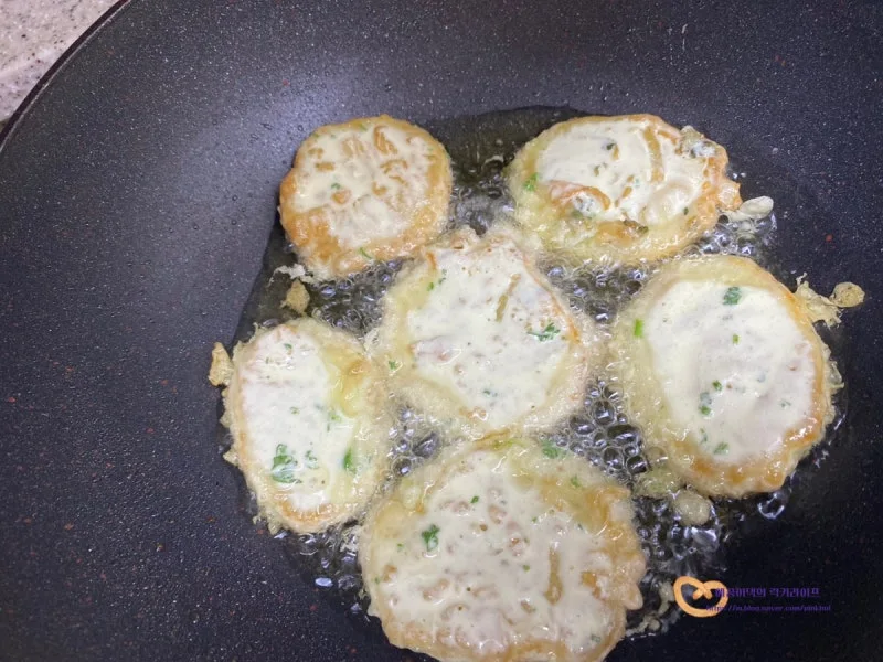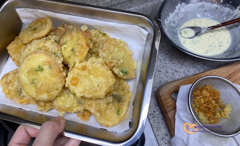 튀김가루 반죽을 입혀서 기름에 튀겨내니