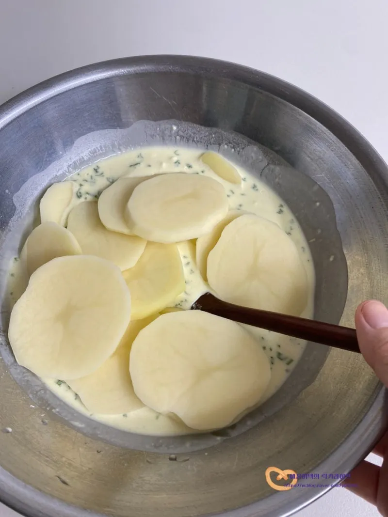 감자 3개 분량의 튀김반죽을 만들어 볼게요