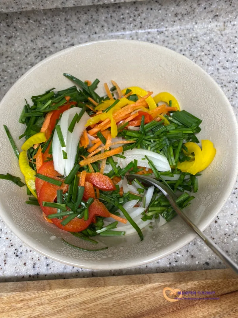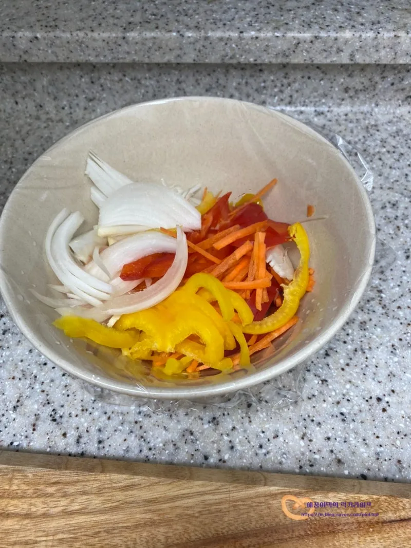 부추를 제외한 양파, 당근, 파프리카를 볼에 담고