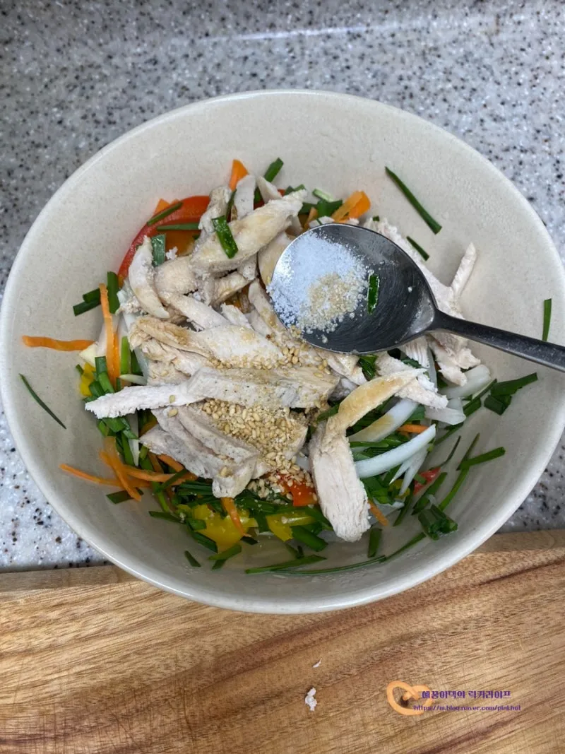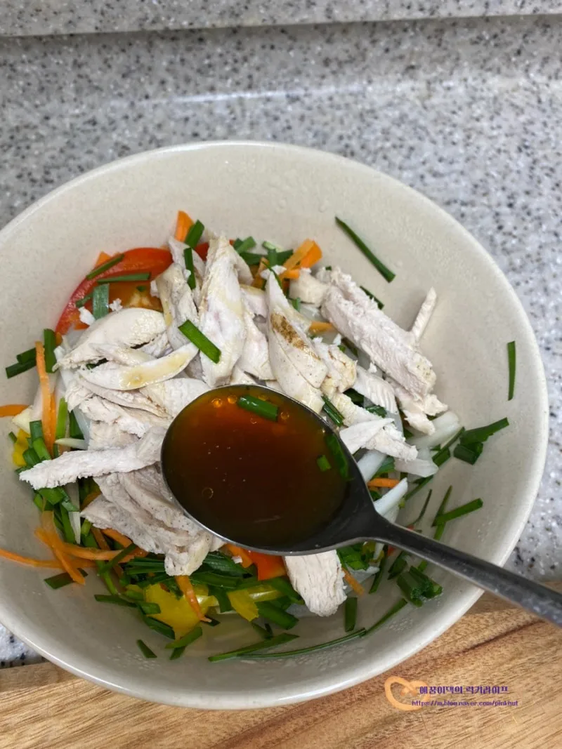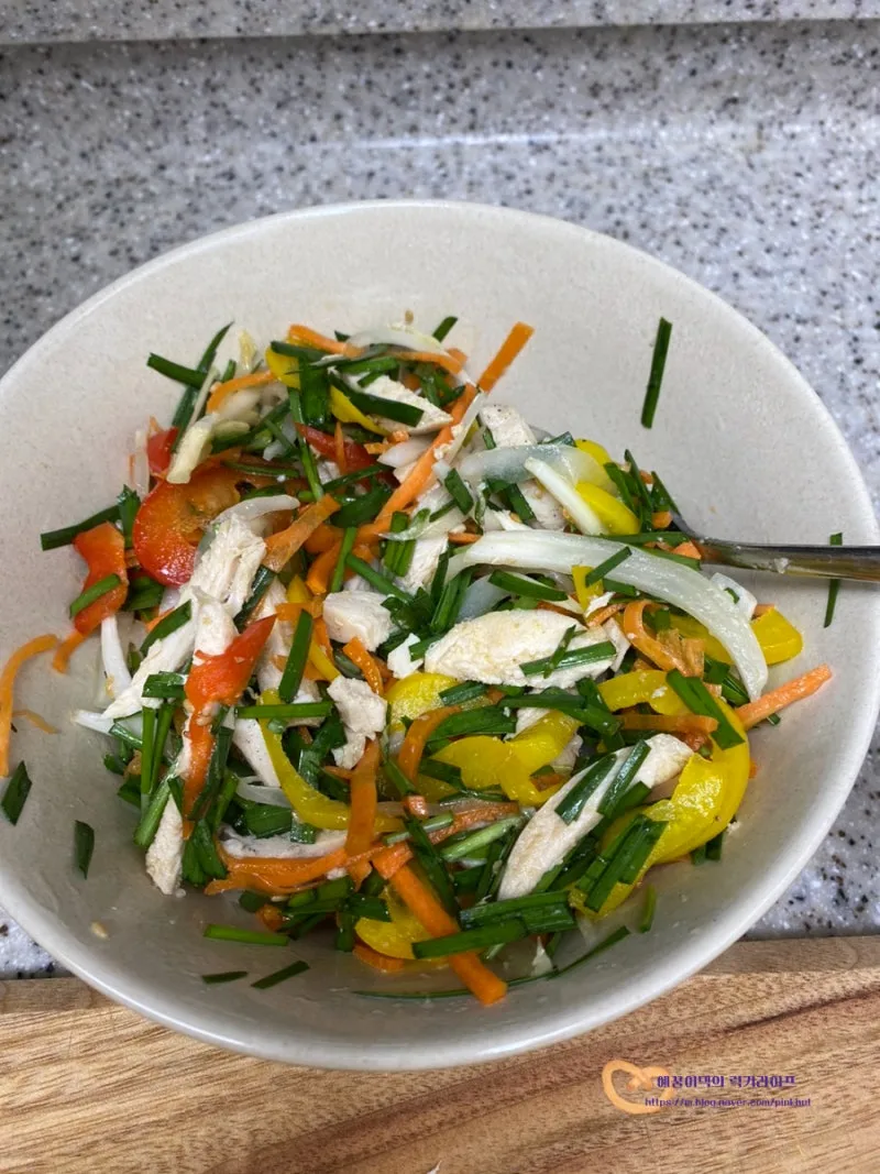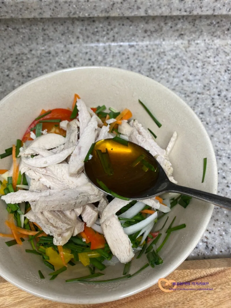 그 위에 닭가슴살야채를 올려줄 텐데요.