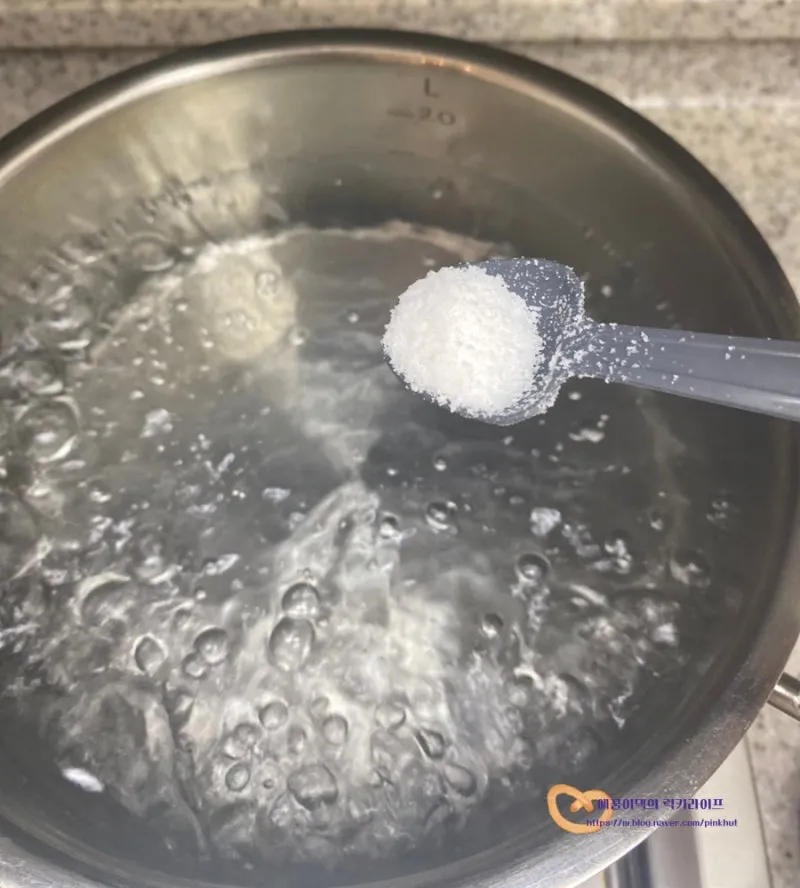 물이 보글보글 끓으면 소금 1/2T를 넣고