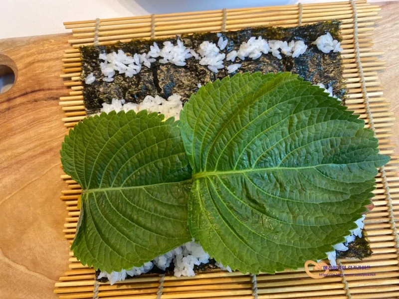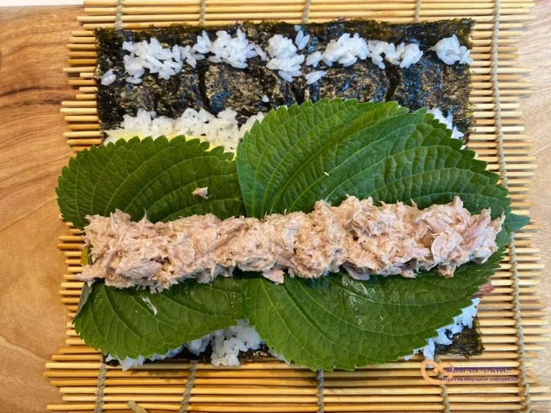 깻잎 두장을 깔고 그 위에 참치마요를 올려서