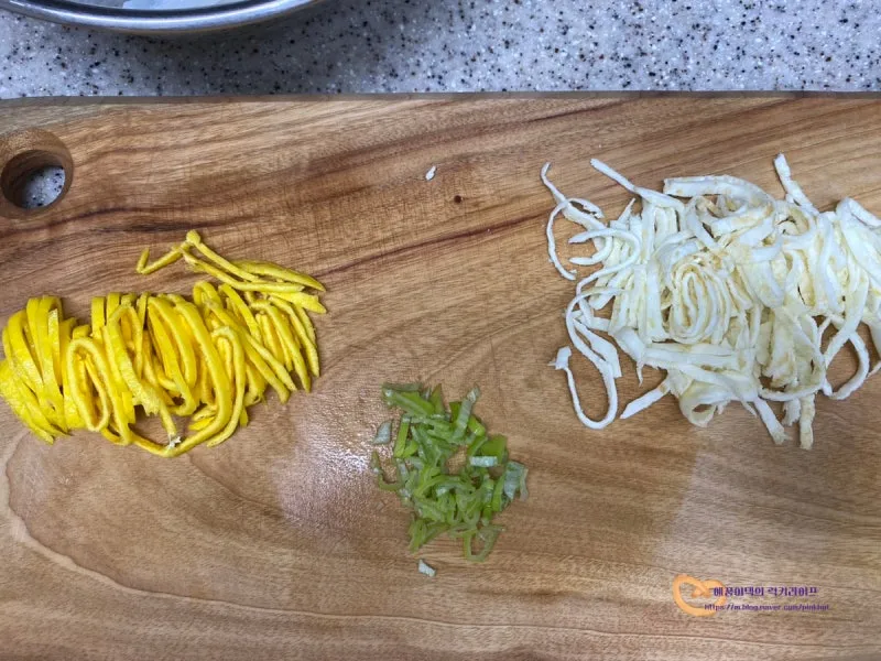 부쳐낸 후에는 돌돌 말아서 얇게 채 썰어주면