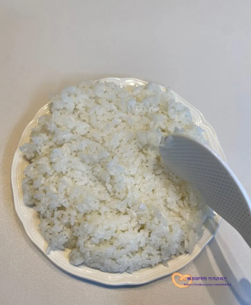 밥 2공기는 접시에 넓게 펼쳐서 잠시