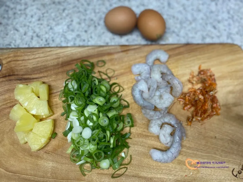 통조림 파인애플과 새우, 계란 스크램블을 넣은