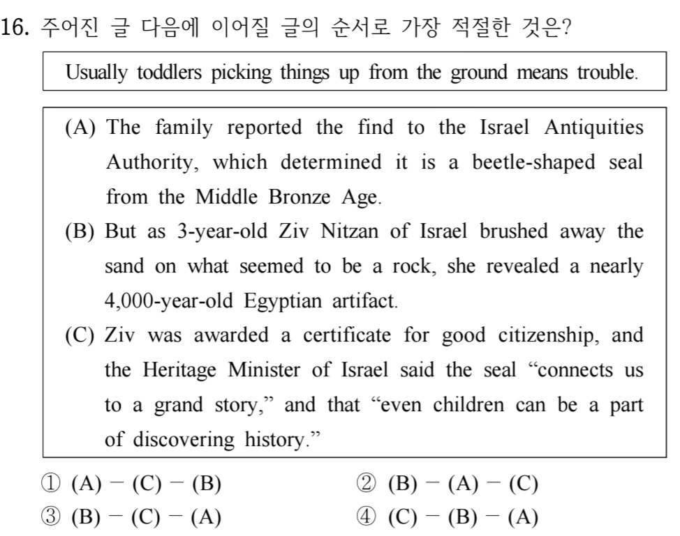 일단 주어진 문장을 잘 읽고 뒤에 올 문장을 빠르게 예측해 본다. 그리고 선택지를 보며 첫 순서로 올 문단을 먼저 확인한다. (아래처럼 A,B,C가 골고루 있는 선택지는 당연히 예측할 필요없음)