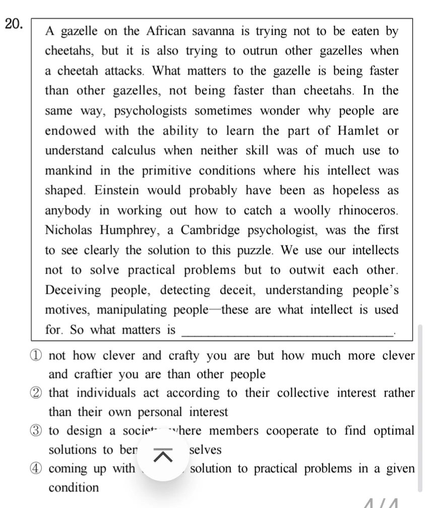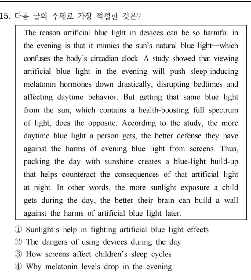 15번 같은 문제는 기본 중의 기본이며 일단 첫 문장과 두번째 문장까지는 온 정신을 집중해서 읽는다. 글쓴이가 무슨 말을 하려는지 궁금해 하면서 또는 주제가 될 만한 단어에 별표를 쳐 놓는 등 표시를 해놓고 시작하는게 필수! 아~ 이게 주제 같은데 다음엔 이렇게 나올것 같은데? 하면서..주의할 점!! 뒷 문장을 예측해야지 내 생각을 집어넣어 억측을 하면 안된다.