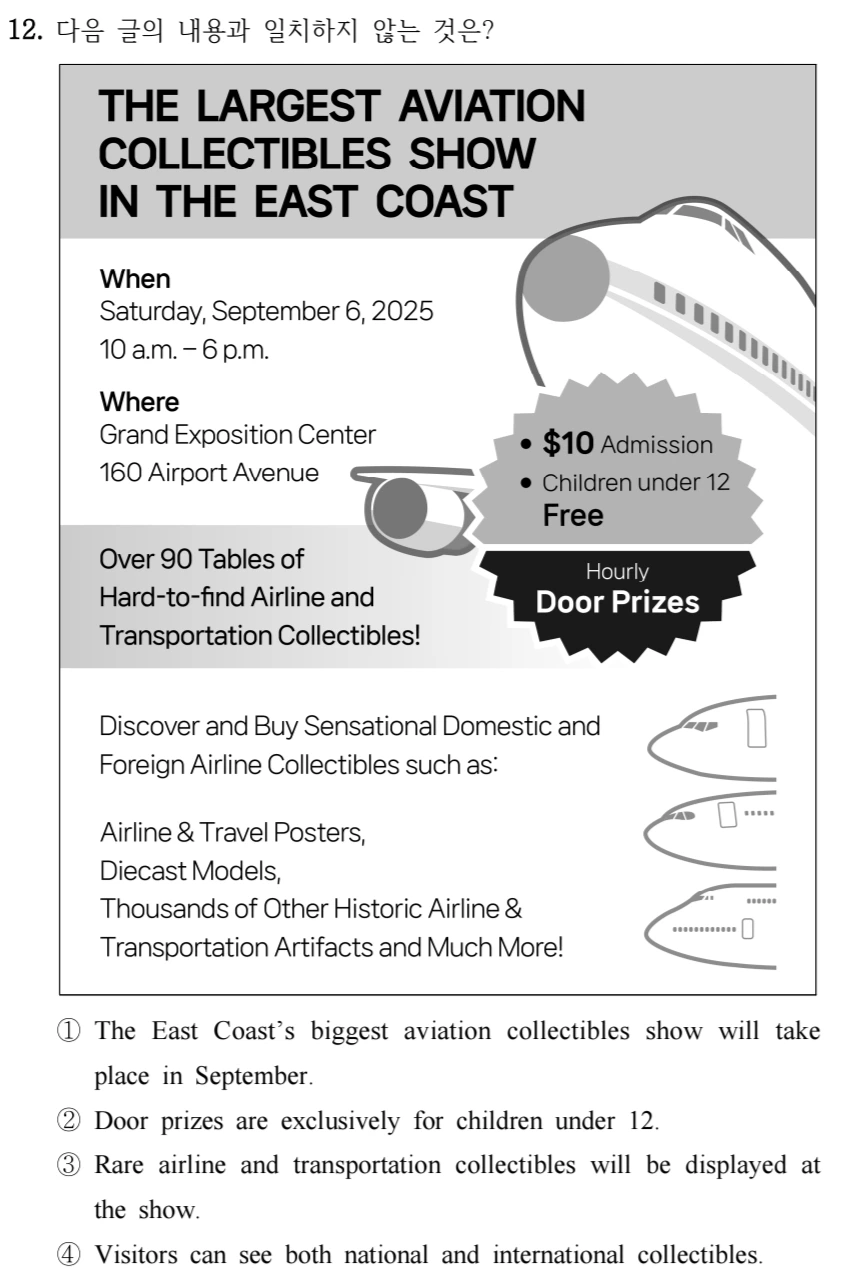선택지에서 눈에 띄는 단어를 체크해서 숨은 그림 찾듯 지문에서 그 단어를 찾는다. 그리곤 선택지와 맞추어 가며 일치인지를 찾는다. 눈이 빠르게 움직이고 고도의 집중력을 요하긴 하지만 익숙하게 꿀팁을 적용한다면 오히려 시간을 줄일 수 있는 문제라고 본다. (선택지 완벽해석은 필수!)