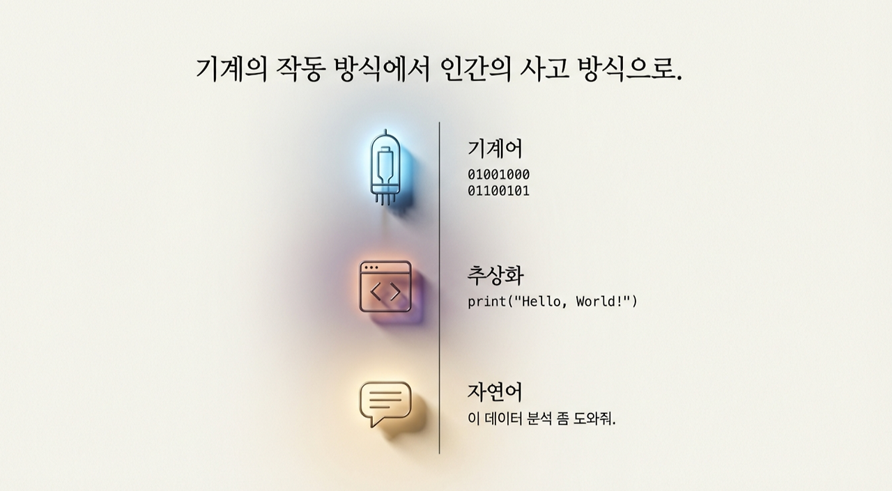 개별 스위치를 관리하는 대신 "이 숫자들을 더해"라고 말하면, 언어가 알아서 복잡한 전기적 세부 사항을 처리해 주었다. 새로운 언어가 등장할 때마다 코드는 인간의 사고와 가까워졌고, 기계의 작동 방식과는 멀어졌다.